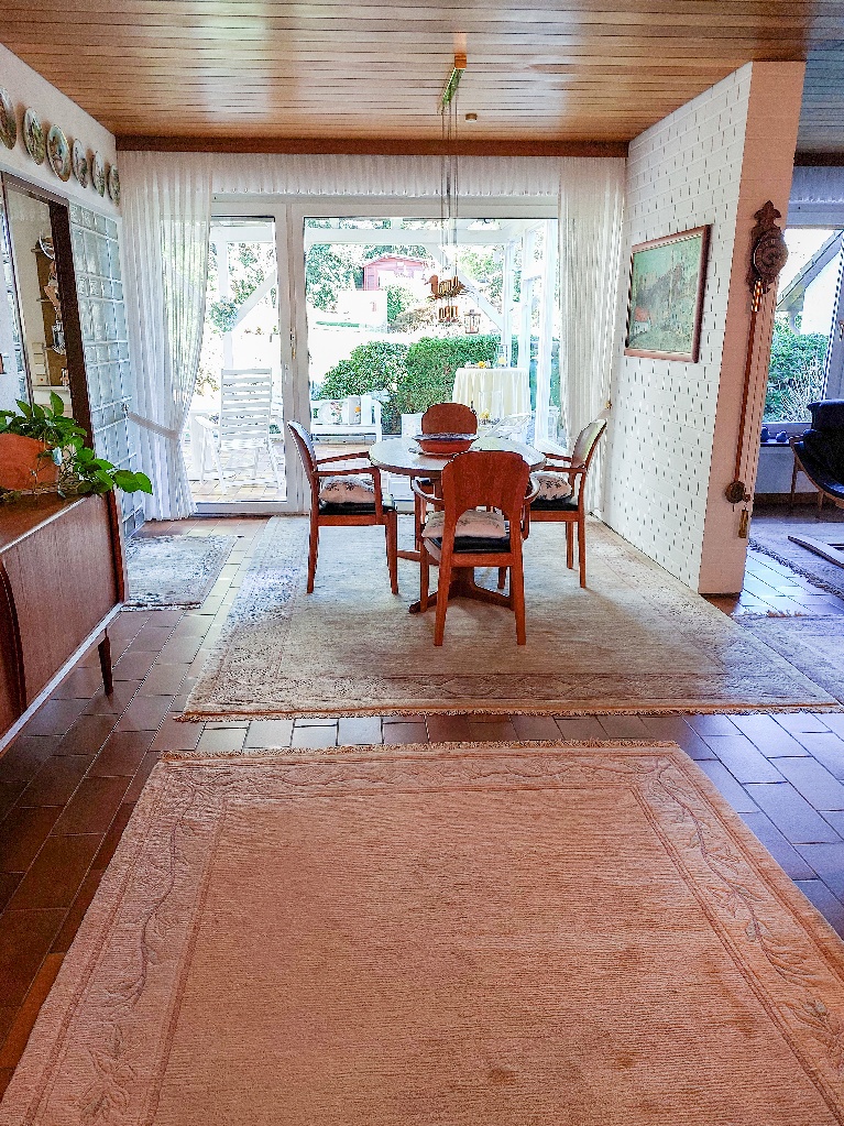 Vom Hausflur aus liegt rechts das Büro/Arbeitszimmer, links das Gäste-WC. Weiter geradeaus befindet sich auf der rechten Seite die gemütliche Bar, dann das Tageslichtbad mit Wanne und Glasdusche sowie ein Zimmer, nutzbar als Schlafzimmer oder Esszimmer. Der sehr üppige Wohn- und Essbereich, links gelegen, mit der angrenzenden Küche gewinnt noch zusätzlich mit dem traumhaften Blick in den wunderschön angelegten Garten.
