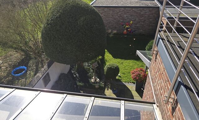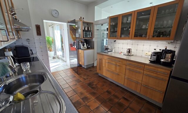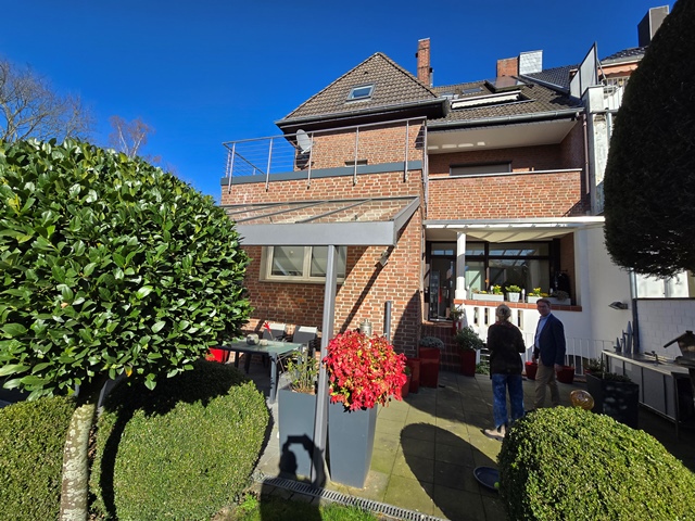 Erdgeschoss ca. 115m² Wohnfläche und 1 Garage. 4 Zimmer, große Küche, Bad mit Wanne und Bidet, vor ca.7 Jahren bodentiefe neue Dusche im Bad. Loggia und sehr große überdachte Terrasse und Garten. Holzdielen und PVC- Belag, Schlafzimmer mit Ankleide. Etwa 2/3 der Wohnfläche Fußbodenheizung. Gaszentralheizung. Eigener Kellerzugang auch von der Terrasse.