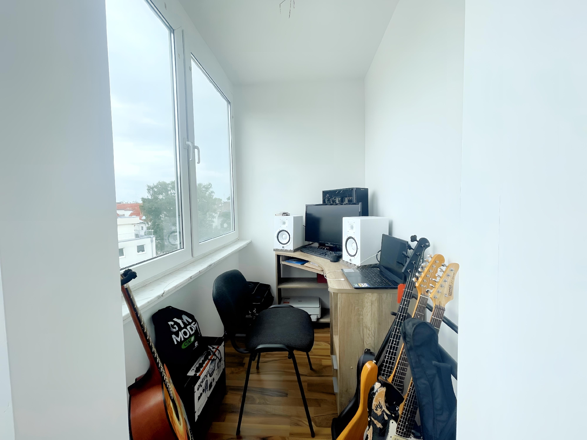 Das Herzstück der Wohnung bildet der geräumige Wohn- und Essbereich mit Zugang zum Balkon, der einen schönen Ausblick ins Grüne ermöglicht. Hier finden Sie ausreichend Platz für gesellige Stunden mit Familie und Freunden.