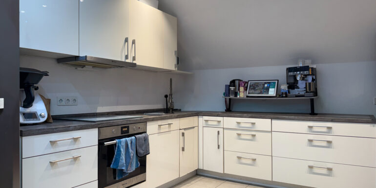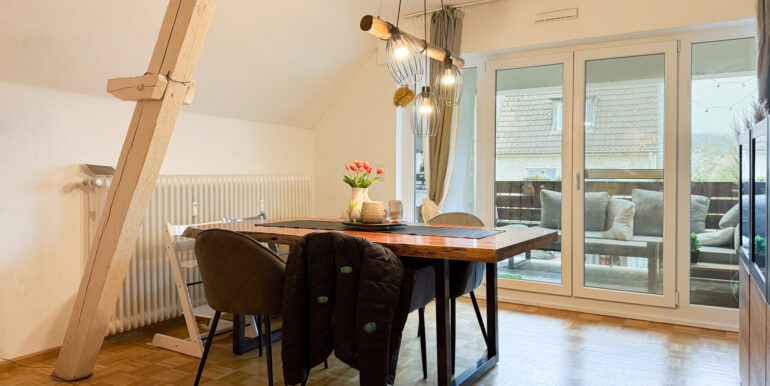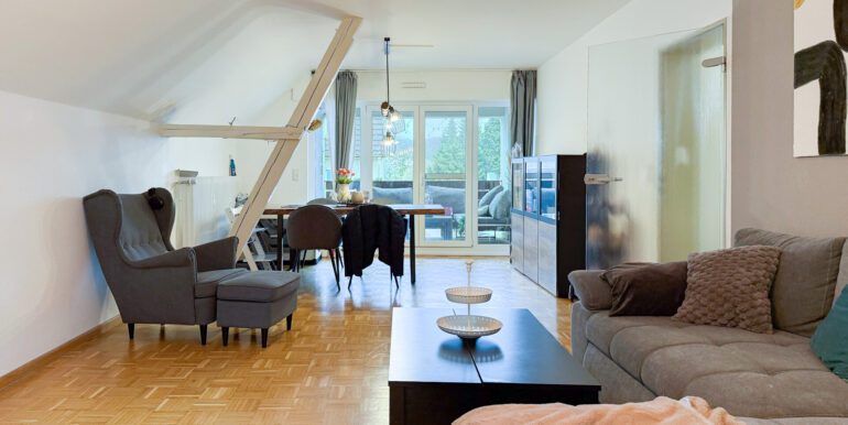 Die offene Küche fügt sich harmonisch in den Wohnbereich ein. Die sichtbare Balkendecke verleiht dem Raum zusätzlichen Charme. Sowohl vom Wohnzimmer als auch vom Schlafzimmer aus gelangen Sie auf die Loggia.