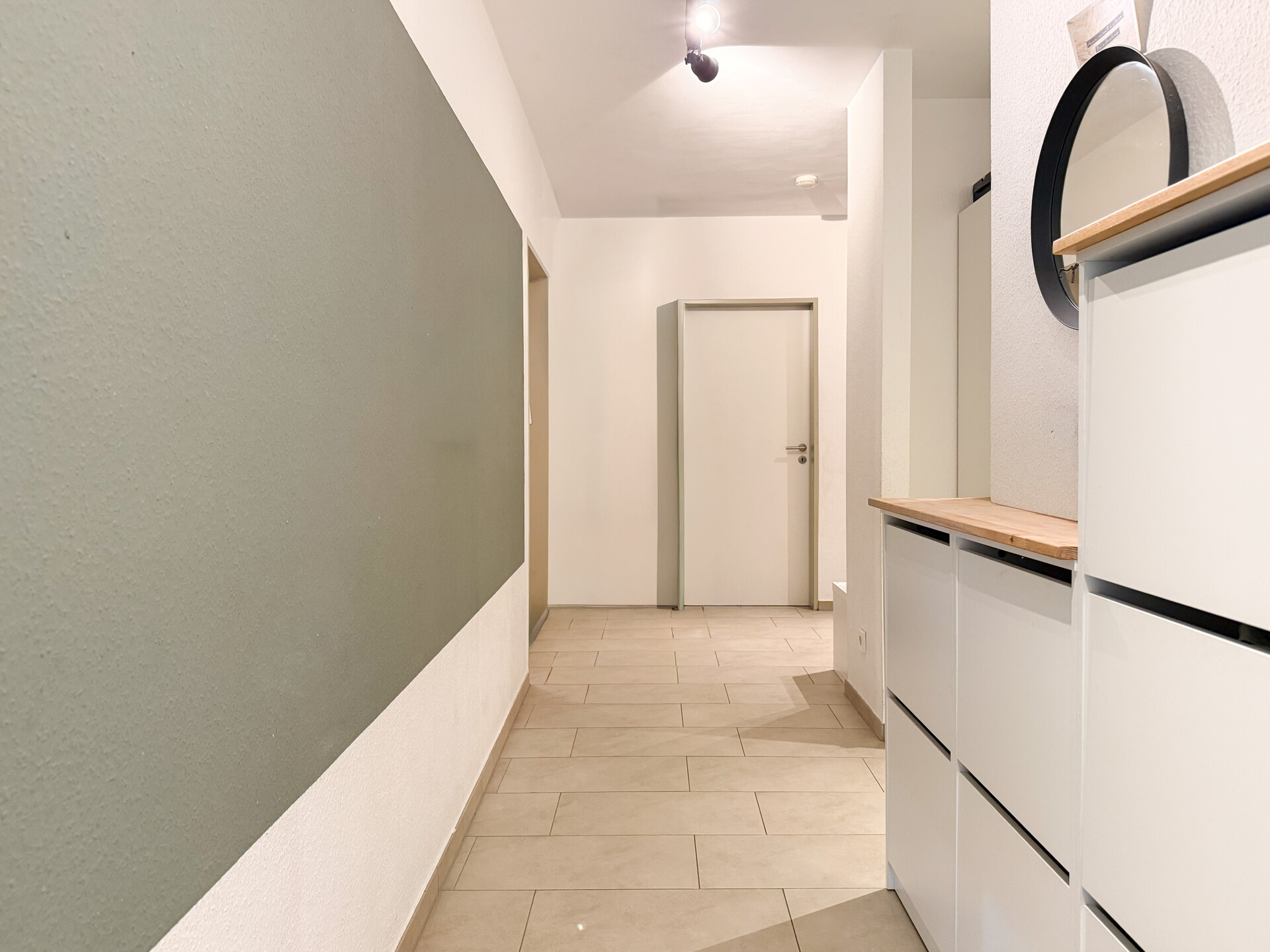 Im Wohnzimmer wurde hochwertiges Eichenparkett verlegt, während in den übrigen Räumen zeitlose Fliesen verwendet wurden. Ergänzend stehen ein Vorratsraum sowie eine Waschküche auf derselben Etage zur Verfügung.