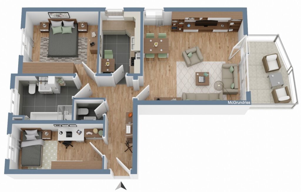Zwei gut geschnittene Schlafzimmer bieten flexible Nutzungsmöglichkeiten, beispielsweise als Schlaf-/, Kinder-/ oder Arbeitszimmer. Das modern geflieste Tageslichtbad ist mit Badewanne und Dusche ausgestattet. Zusätzlich steht ein innenliegendes Gäste-WC zur Verfügung.