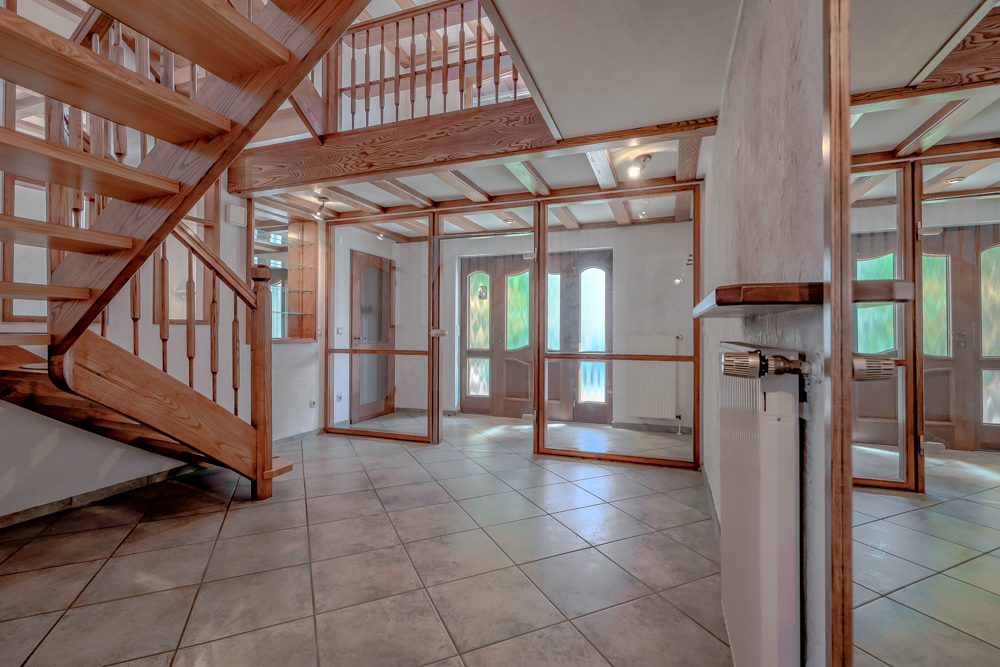 Das Highlight: Das maßgefertigte Treppenhaus, das sich eindrucksvoll vom Erdgeschoss bis unter die Dachspitze zieht. Besonders zur Weihnachtszeit schafft es den perfekten Rahmen für einen festlich geschmückten Baum – ein einzigartiges Ambiente, das Sie begeistern wird.