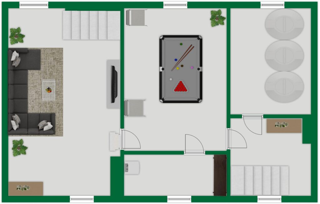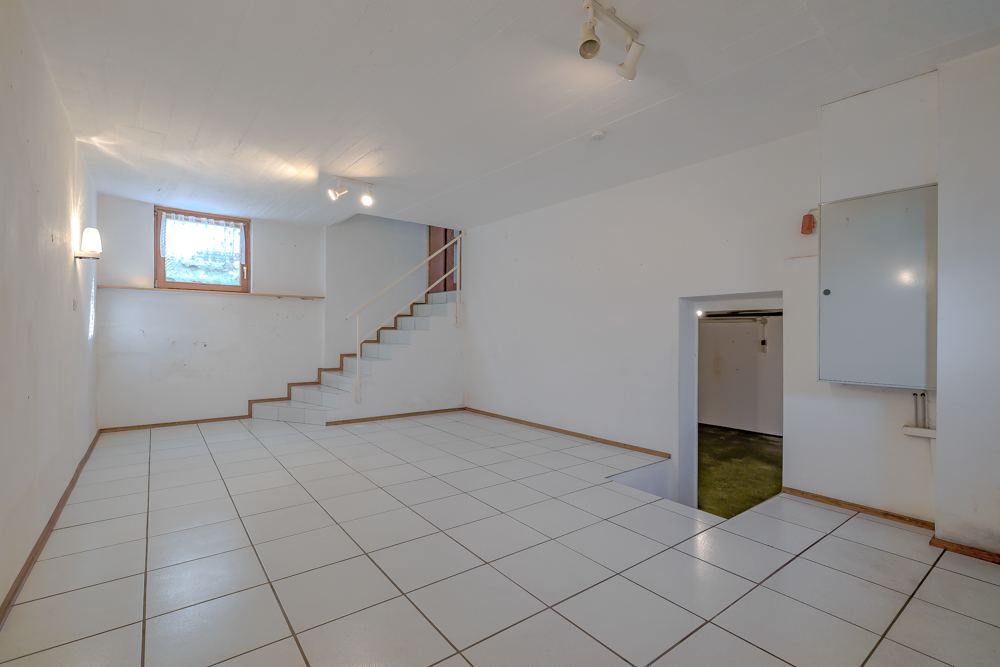 • Kellergeschoss: Über zwei Treppen vom Erdgeschoss erreichbar. Hier befinden sich ein großer, gefliester und beheizter Hobbyraum, ein großzügiger Vorratsraum, der Heizungskeller (Ölheizung, Baujahr 1996) sowie der Öltankraum.