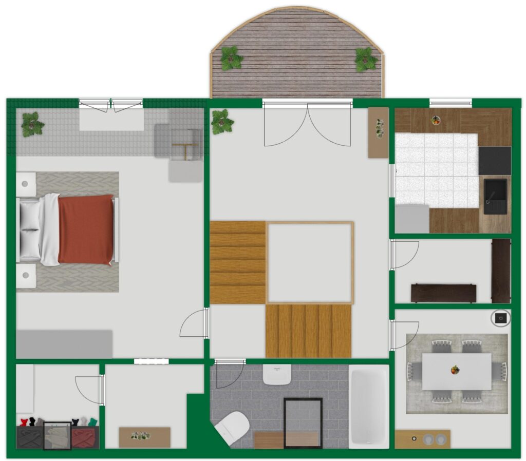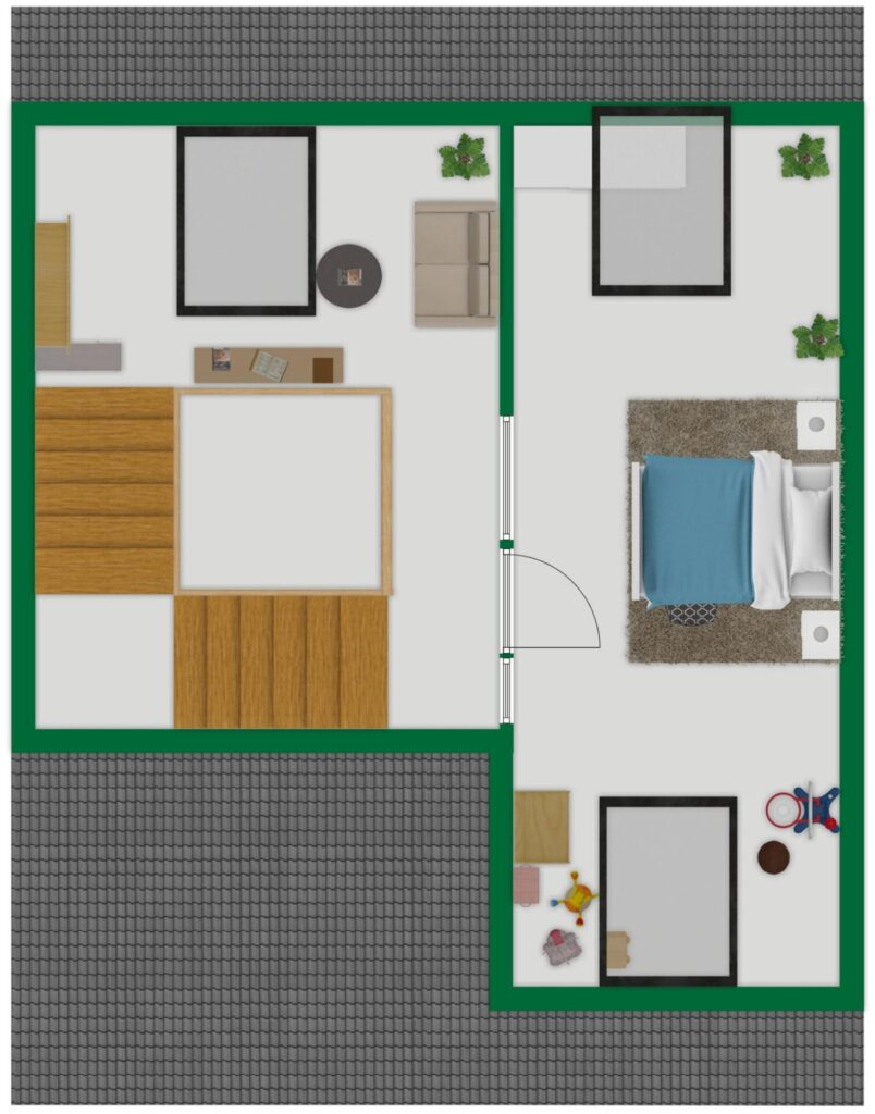• Dachgeschoss: Offene Galerie mit vielfältigen Nutzungsmöglichkeiten (z. B. Arbeitszimmer) sowie ein weiteres Schlafzimmer.