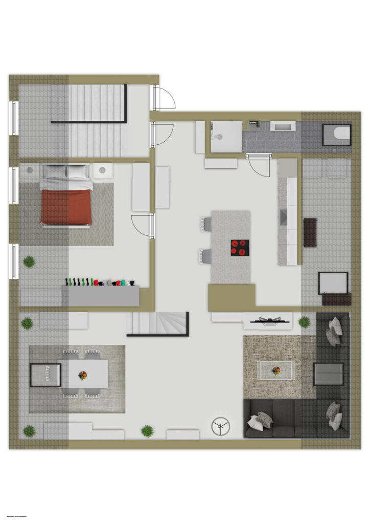 Das Wohnzimmer lädt zum Entspannen ein, das Schlafzimmer bietet Ruhe und Rückzug, und die moderne Küche lässt keine Wünsche offen. Das stilvolle Badezimmer überzeugt mit hochwertigen Armaturen und zeitlosem Design.