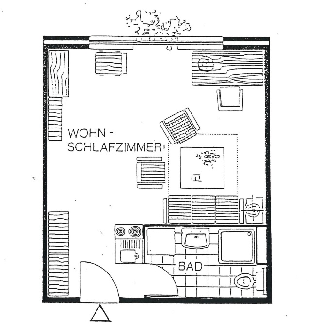Der Wohn- und Schlafbereich verfügt über eine integrierte Pantryküche, ergänzt durch ein separates Duschbad.