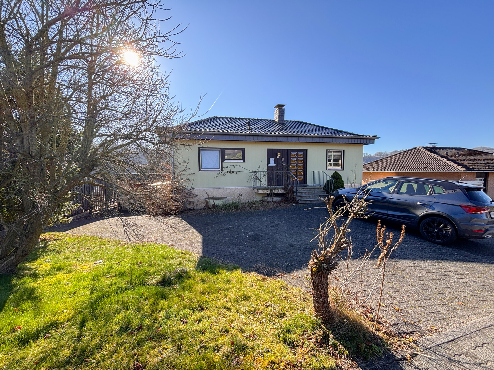 Der Ihnen hier angebotene Walmdach-Bungalow der Firma Hanse wurde 1981 in Fertigteilebauweise errichtet und verfügt über ein massiv errichtetes Kellergeschoss. Die Immobilie bietet mit rund 168 m² Wohnfläche vielfältige Nutzungsmöglichkeiten. Ursprünglich als Zweifamilienhaus geplant und im Jahr 2003 zu einem weitläufigen Einfamilienhaus zusammengeführt, eignet sich das Objekt sowohl als komfortables Familiendomizil als auch ideal für die Kombination aus Wohnen und Arbeiten. Ein Rückbau in zwei separate Wohneinheiten ist bei Bedarf unkompliziert realisierbar. Im Erdgeschoss befinden sich eine Küche, ein offenes und luftiges Esszimmer mit Zugang auf den ca. 40 m² großen, überdachten Balkon, ein Badezimmer, sowie zwei flexibel nutzbare Zimmer, die sich als Schlafzimmer oder Büro anbieten. Das Untergeschoss bietet ebenfalls vollwertige Wohnqualität. Hier erwartet Sie ein großes, offenes Wohnzimmer mit direktem Zugang zur Terrasse und in den Garten. Ergänzt wird diese Ebene durch ein Schlafzimmer, ein Badezimmer, sowie den Zugang zum Kellerbereich mit zwei Kellerräumen.