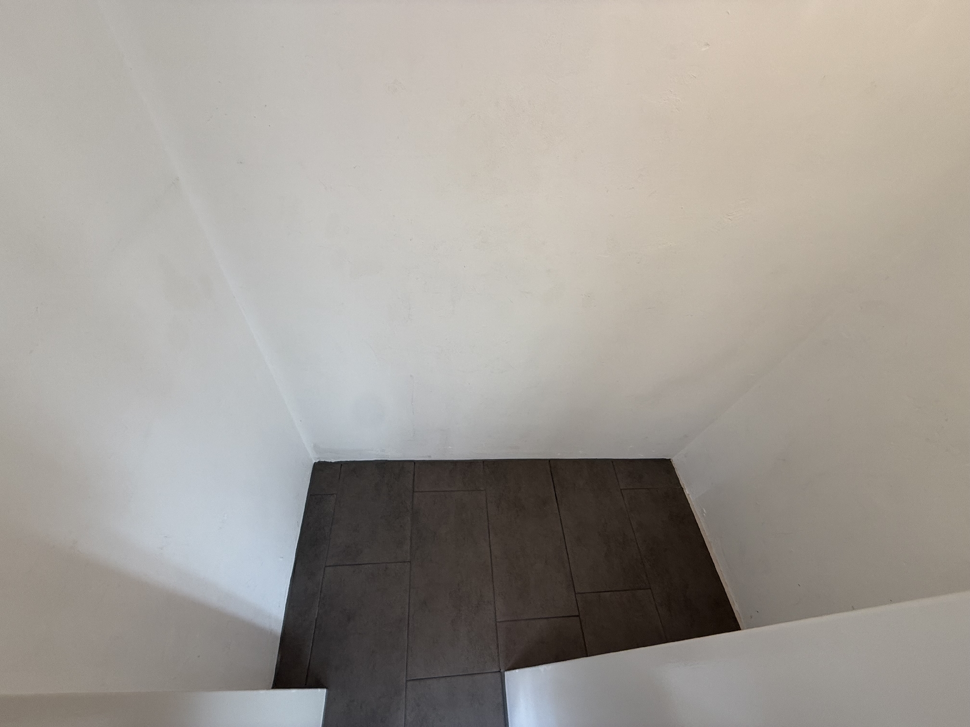 – graue Bodenfliesen in Flur, Abstellraum und Kochnische