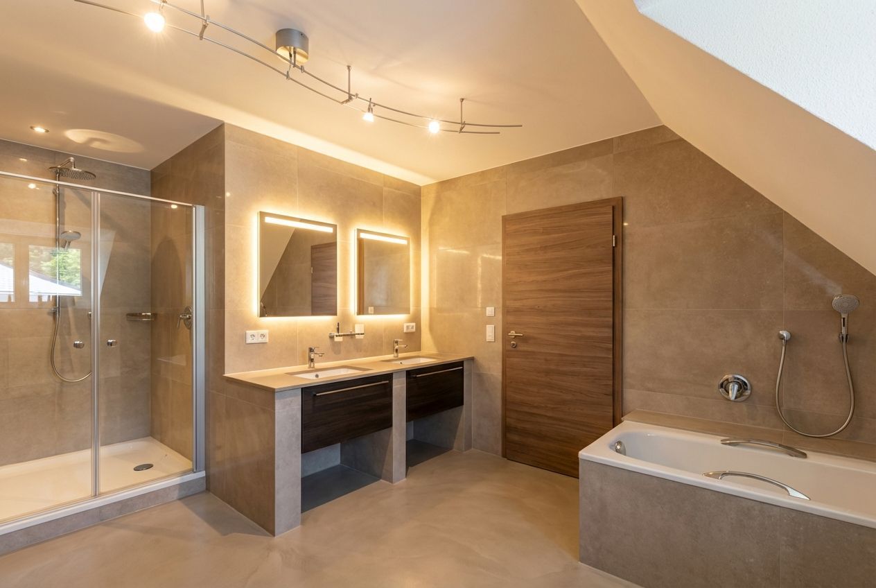 Im Obergeschoss stehen drei Schlafzimmer zur Verfügung, die jeweils über einen eigenen Zugang zu einem Badezimmer verfügen. Ein seltener Komfort, der den Wohnwert deutlich erhöht. Zusätzlich ist ein Ankleidezimmer vorhanden, das an eines der Schlafzimmer anschließt.
