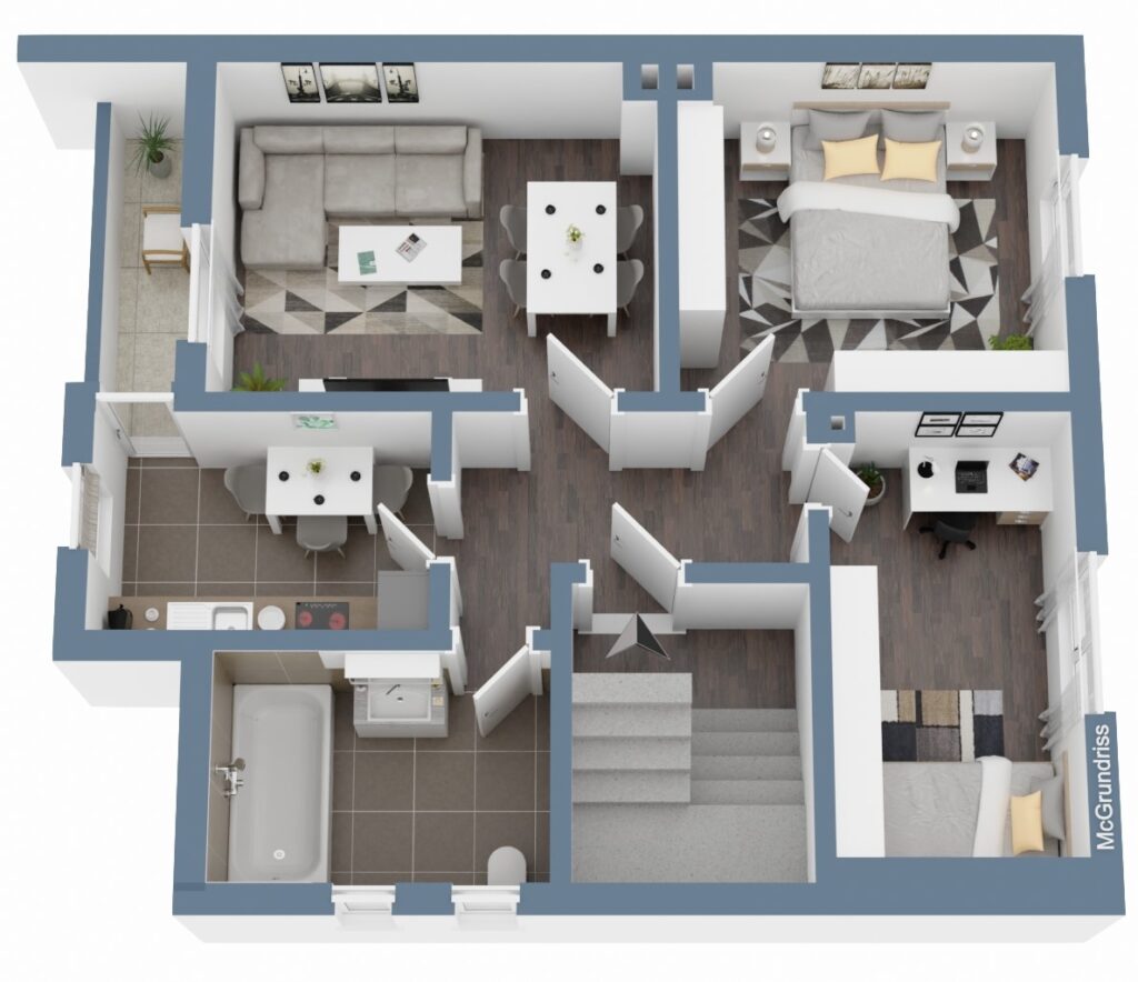 Das Haus bietet insgesamt ca. 200 m² Wohn-/ Nutzfläche, verteilt auf drei gut geschnittene Wohneinheiten. Im Erdgeschoss und Obergeschoss befinden sich jeweils 3-Zimmer-Wohnungen. Aktuell verfügt die Erdgeschosswohnung jedoch nur über zwei Zimmer, da durch das Entfernen einer Wand ein großzügig offen gestalteter Wohn-/ und Essbereich geschaffen wurde. Im Dachgeschoss befindet sich eine 2-Zimmer-Wohnung mit offenem Wohn-/ und Küchenbereich. Darüber hinaus steht im Dachgeschoss ein zusätzlich, separat gelegenes Arbeitszimmer zur Verfügung.