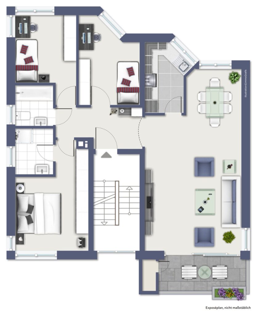 Die genaue Aufteilung entnehmen Sie bitte dem beigefügtem Grundriss.
