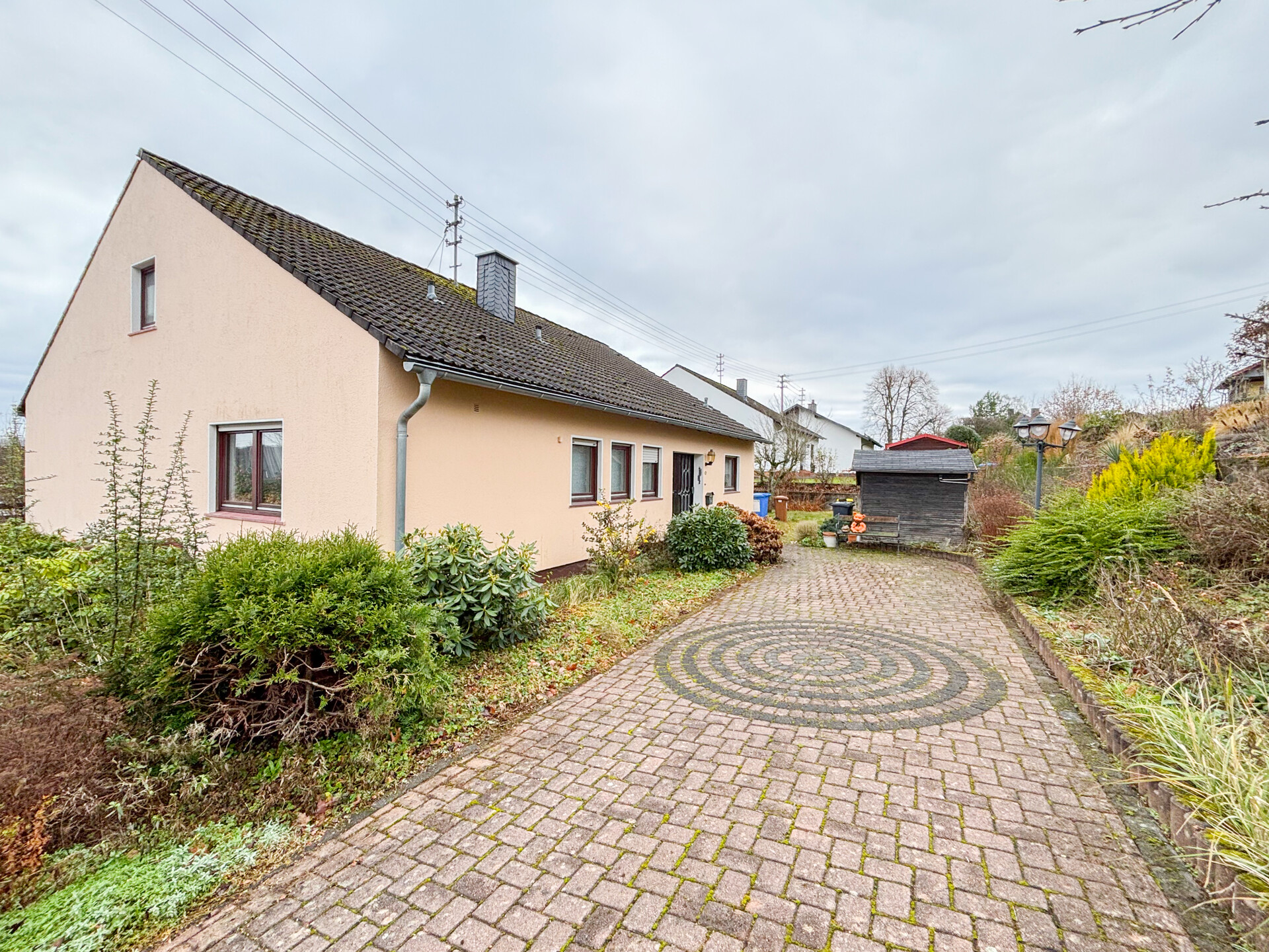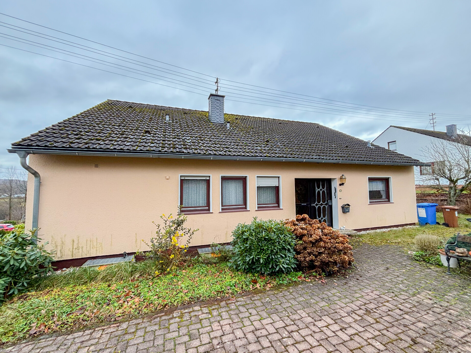 Dieses Einfamilienhaus in attraktiver Bungalow-Bauweise bietet ca. 121 m² Wohnfläche und ein großzügiges Grundstück von rund 995 m². Der durchdachte Grundriss umfasst 4 Zimmer, darunter 3 Schlafzimmer sowie einen offenen, lichtdurchfluteten Wohn- und Essbereich mit Zugang zur Terrasse – ideal zum Entspannen und Wohlfühlen. Zwei Badezimmer sorgen für zusätzlichen Komfort. Das Haus ist vollständig unterkellert. Im Untergeschoss stehen ein Hobbyraum/Wohnraum ein Abstellraum, sowie ein großzügiger Partyraum mit eigener Bar und ein Hobbyraum /Wohnraum zur Verfügung – perfekt für Feiern, Hobbys oder als zusätzlicher Freizeitbereich oder Wohnberreich. Zudem verfügt die Immobilie über zwei Garagen und einen begehbaren Stauraum im Dachbereich. Als Varidomo Massiv-Fertighaus errichtet, überzeugt das Objekt durch seine solide Bauweise und hochwertige Materialien – ein ideales Zuhause für alle, die Qualität und Wohnkomfort schätzen.