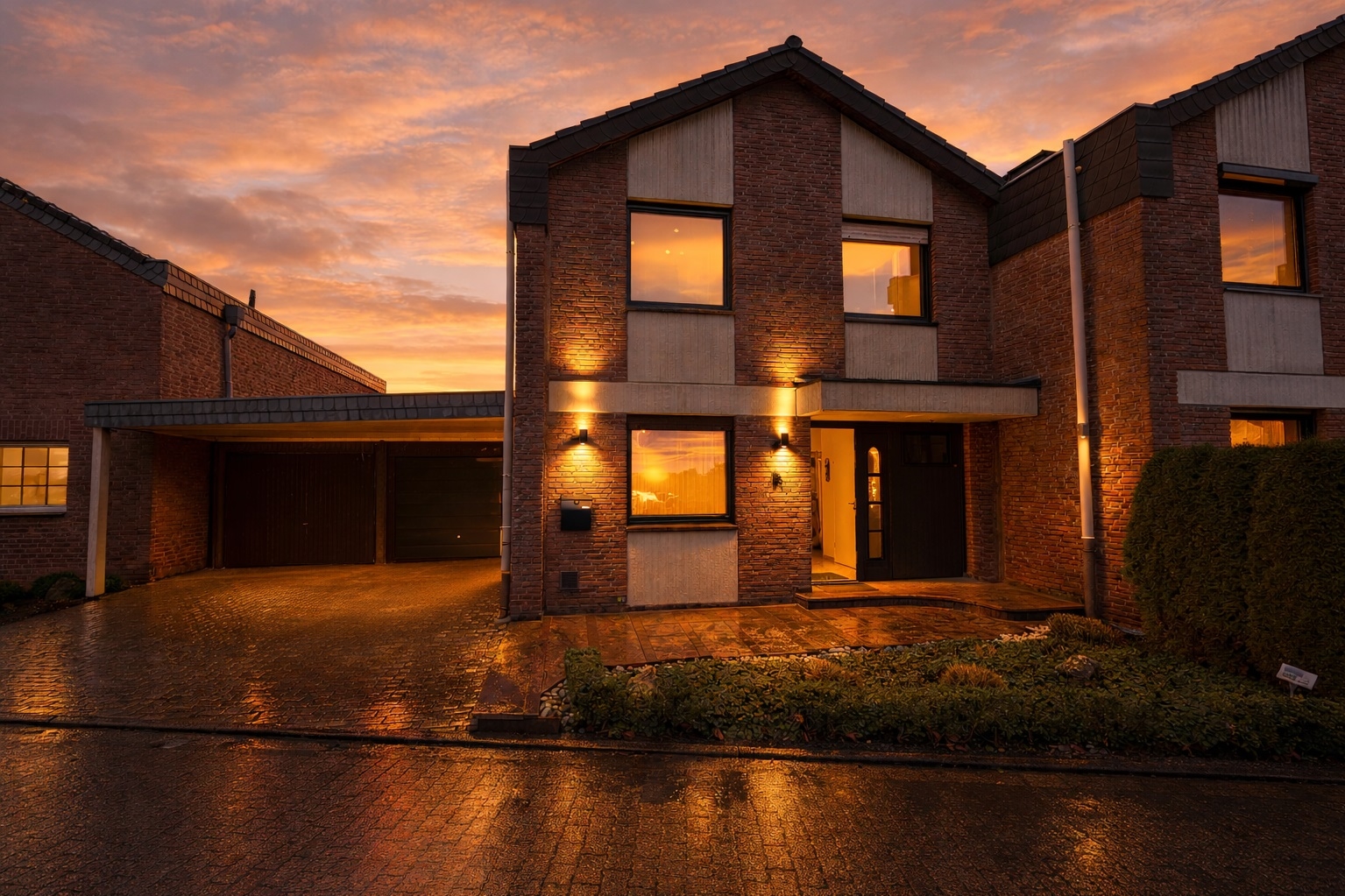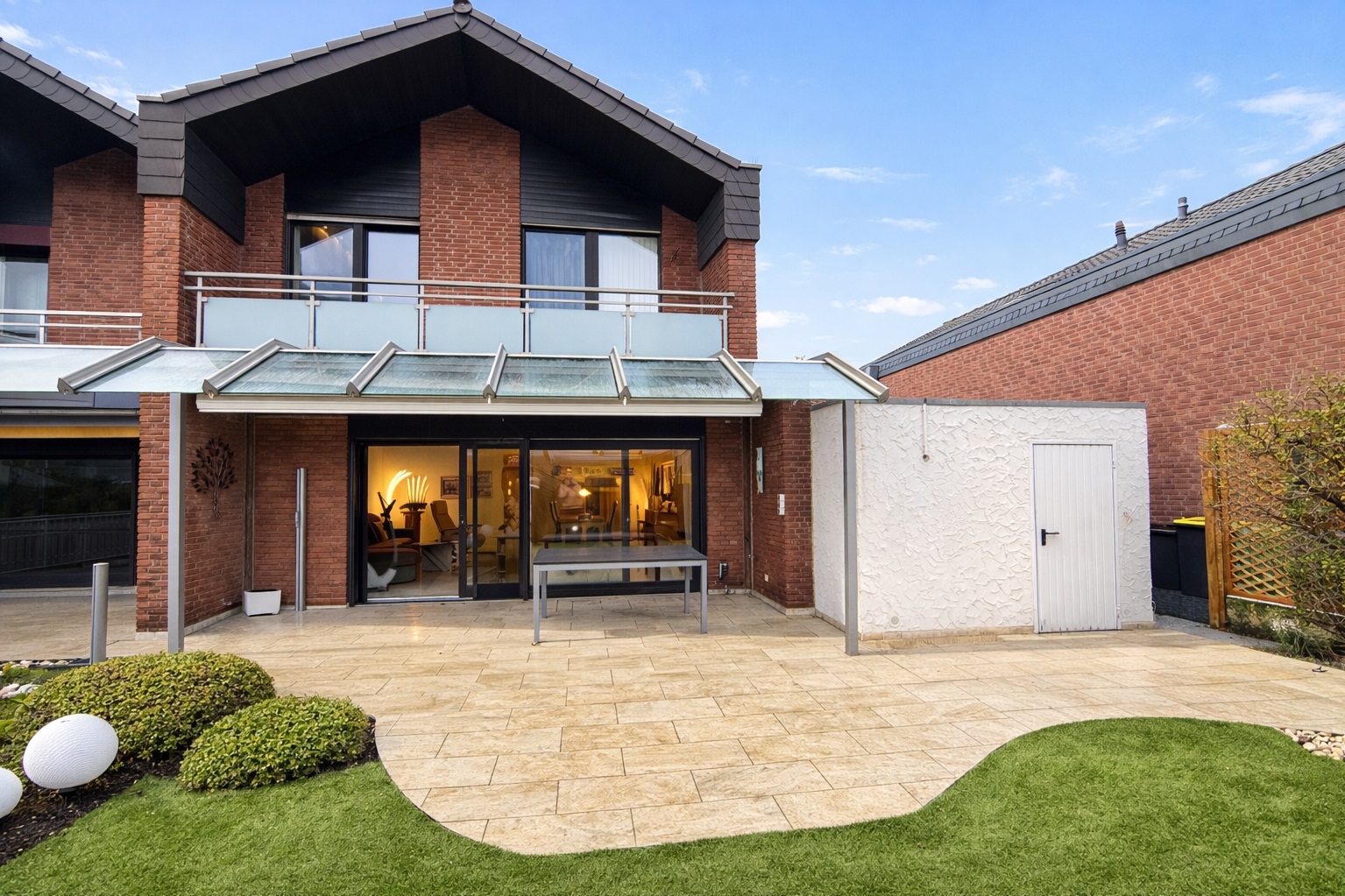 Die überdachte Terrasse mit Glasdach erweitert den Wohnraum nach draußen und schafft einen geschützten Bereich für entspannte Stunden im Freien. Der gepflegte Garten ist attraktiv angelegt und bietet eine angenehme Privatsphäre perfekt für Familien oder Gartenliebhaber.