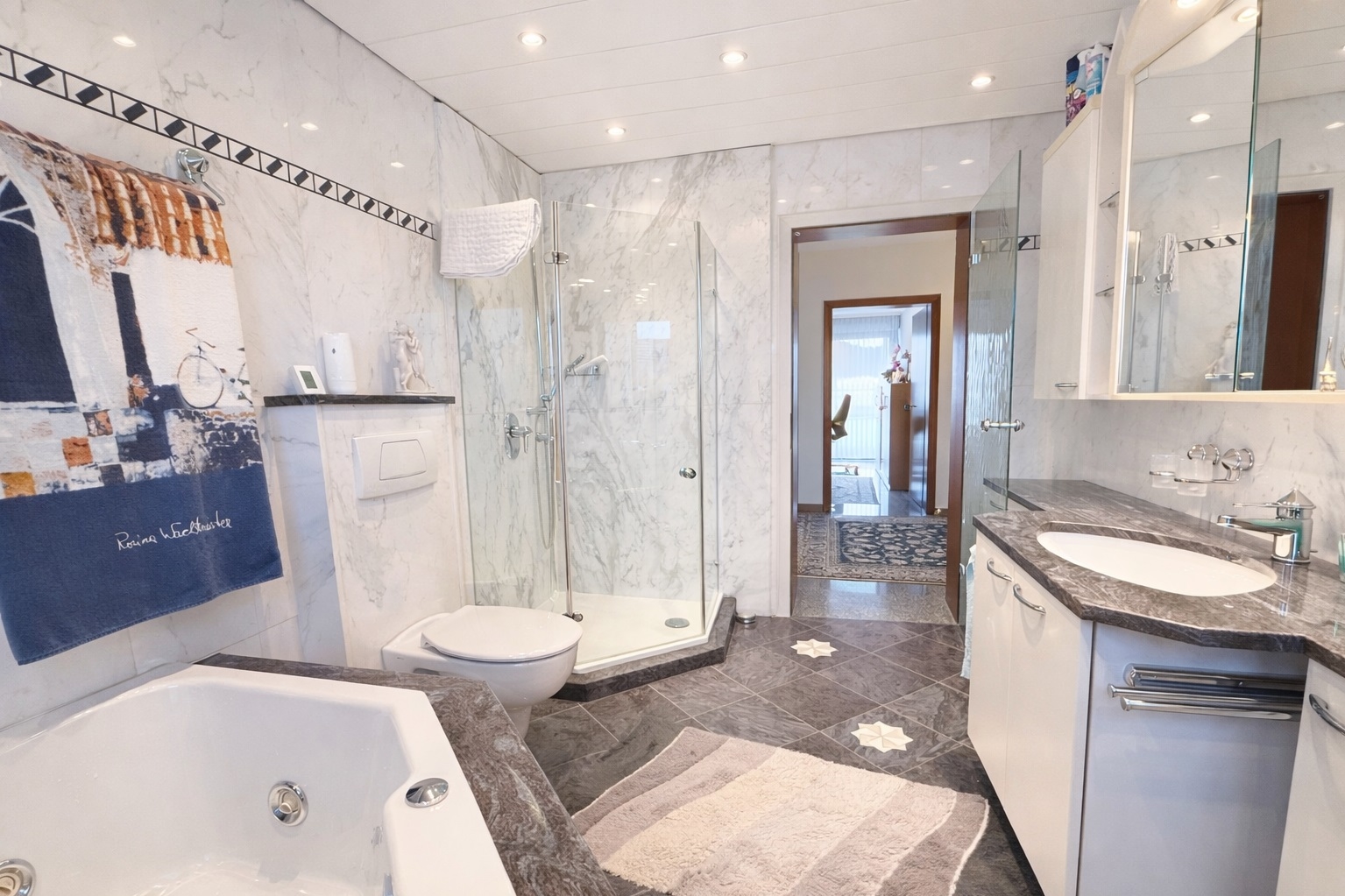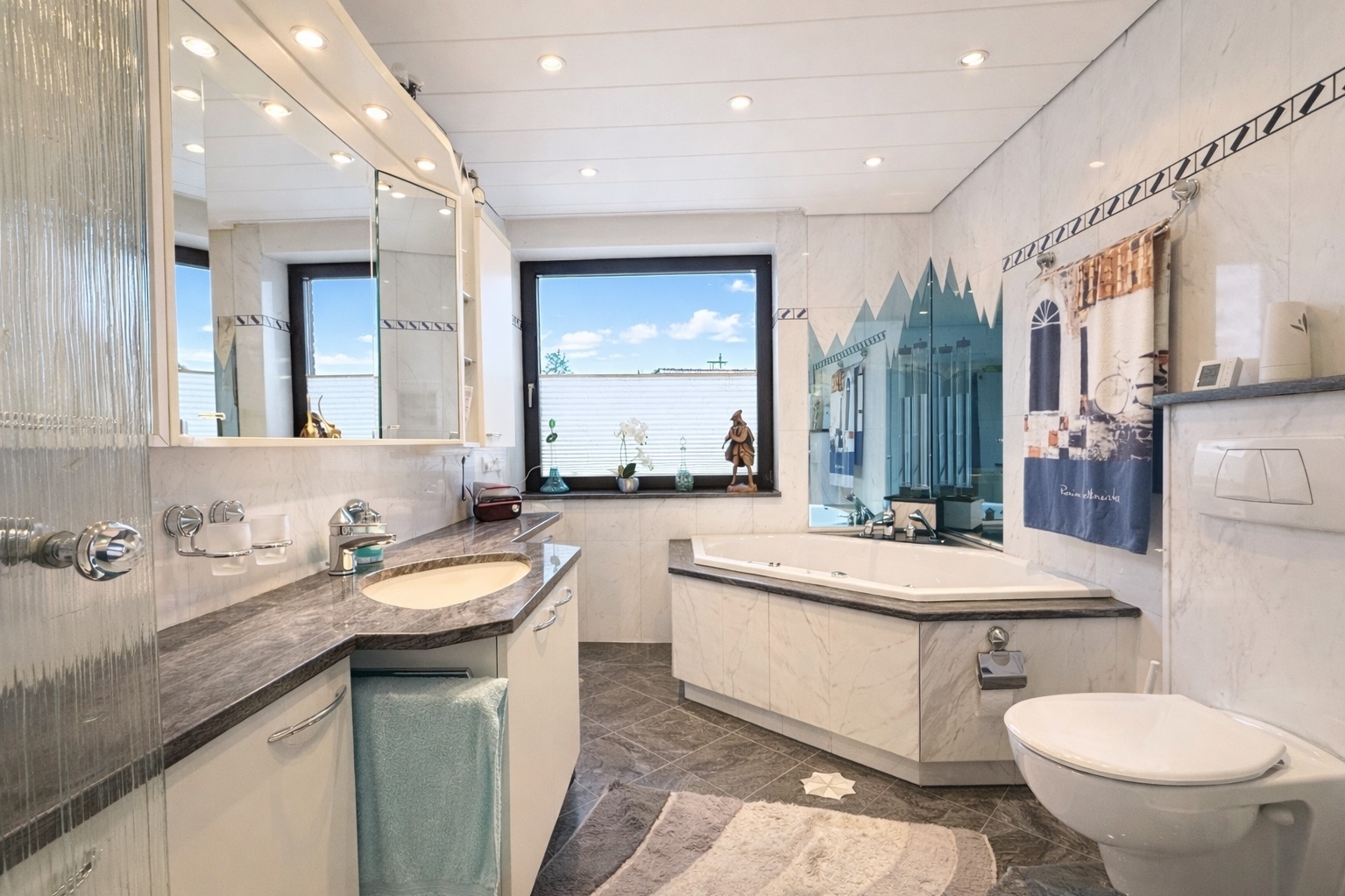 Das Badezimmer ist hochwertig ausgestattet und verfügt über eine Eckbadewanne, eine separate Dusche, ein großes Waschbecken sowie Tageslicht. Helle Fliesen und moderne Einbauten unterstreichen den gepflegten Eindruck.