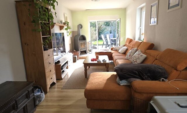 Bereits beim Betreten des Hauses empfängt Sie ein ansprechender Dielenbereich, von dem aus Sie in das 2014 renovierte Esszimmer mit Parkettboden und in die angrenzende 2020 vollständig sanierte Küche mit moderner Einbauküche (kann nach Absprache/Verhandlungsbasis übernommen werden) gelangen. Das Badezimmer im EG, mit einer bodentiefen Dusche, wurde 2016 modernisiert. Das Herzstück des Hauses bildet der offen gestaltete Wohnbereich mit Kaminofen und einer bodentiefen Fensterfront, die direkten Zugang zur großzügigen Terrasse (ca.31m²) bietet. Die Terrasse wurde 2024 neu angelegt und mit moderner Entwässerung ausgestattet. Zusätzlich steht eine seitlicher Hofbereich von ca.22m² mit Holzlager-Unterstand zur Verfügung. Terrasse und Garten bieten ideale Voraussetzungen für entspannte Stunden im Freien oder gesellige Abende mit Gästen.
