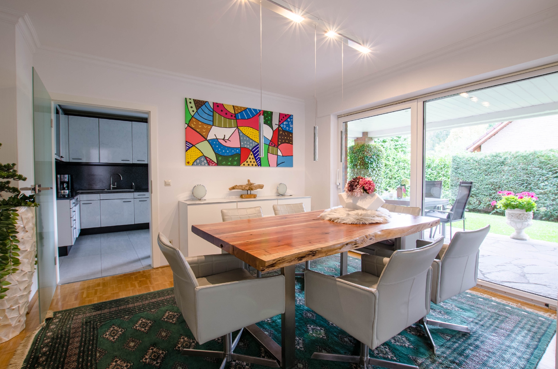 Das Erdgeschoss umfasst ca.137 m² verfügt über 2 geräumige Zimmer, Küche, Diele und Bad. Das gut geschnittene Wohnzimmer mit dem angrenzenden Essbereich, ist ideal für gesellige Abende. Von hier haben Sie Zugang auf die sonnige Terrasse und den Garten. Ein Ruhebereich zum Entspannen und verweilen.