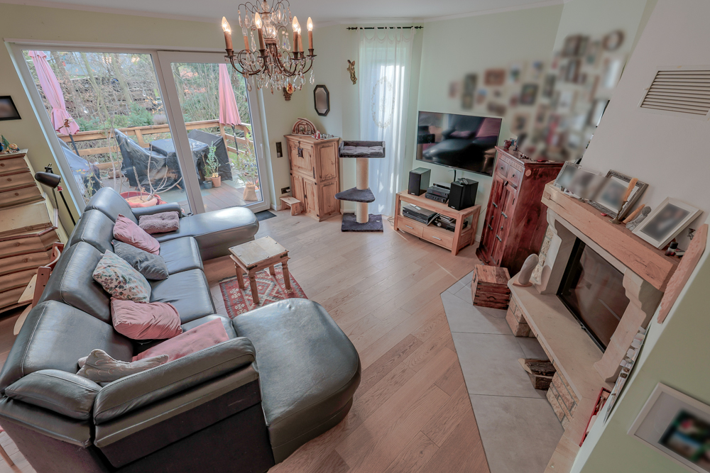 Der Zugang zur Hauptwohnung erfolgt über das Erdgeschoss. Bereits beim Betreten empfängt eine großzügige Diele, von der aus ein Gäste-WC, ein Zimmer sowie der offen gestaltete Wohn- und Essbereich erschlossen werden. Dieser bildet das Herzstück des Hauses und überzeugt durch seine Großzügigkeit, hochwertige Parkettböden und eine offene Küche mit exklusiver Einbauküche, die bereits im Kaufpreis enthalten ist. Die Küche ist mit einer Granit-Arbeitsplatte ausgestattet und fügt sich harmonisch in den Wohnbereich ein. Ein großer Kaminofen sorgt für eine behagliche Atmosphäre.