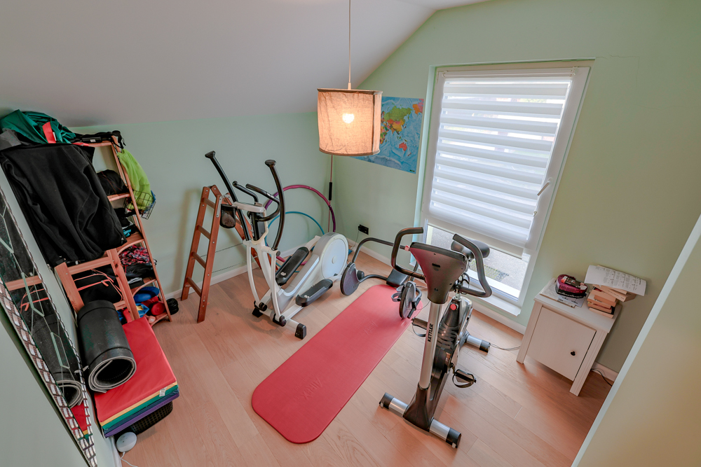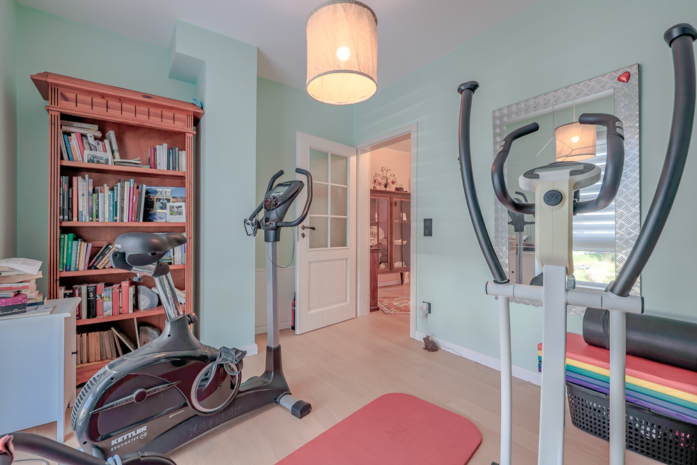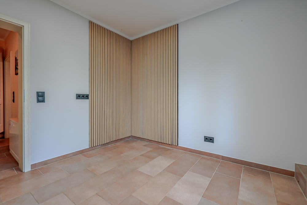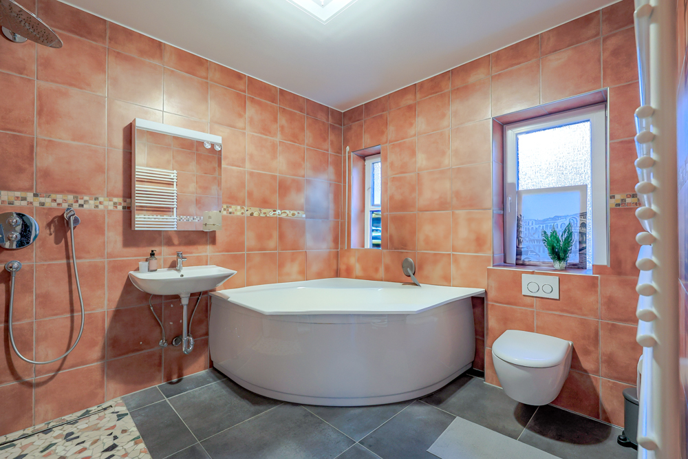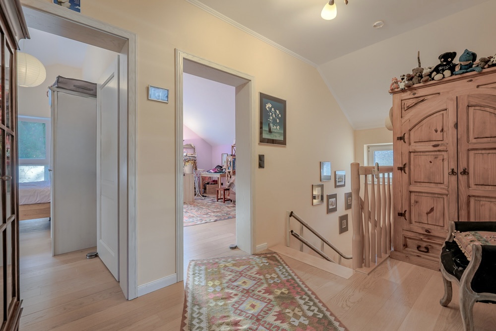 Im Obergeschoss stehen drei Zimmer sowie ein großzügiges Badezimmer zur Verfügung. Das Bad ist hochwertig ausgestattet und bietet eine integrierte Sauna, eine ebenerdige Dusche, eine Eckbadewanne mit Whirlpool-Funktion, einen Handtuchheizkörper sowie ein Fenster. Die durchdachte Planung ermöglicht komfortables Wohnen auch bei eingeschränkter Mobilität.