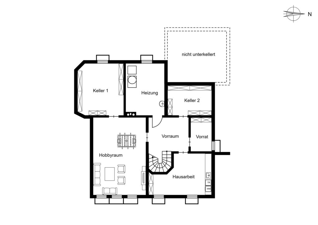 Der vollunterkellerte Bereich umfasst sechs Räume, inklusive eines Hobbyraums, Vorratsraums und weiterer flexibel nutzbarer Flächen. Die Zentralheizung aus dem Jahr 2008 arbeitet mit Gas als Energieträger.