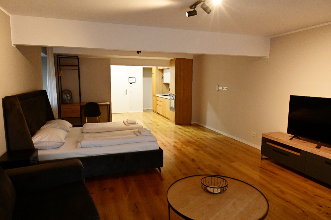 Bodentiefe Fenster sorgen für eine helle Wohnung, egal ob die Sonne scheint oder nicht. Ein großzügiges Wohnzimmer mit offener Einbauküche, überdachtem Balkon und einem großzügigen Wohn-Schlafzimmer mit Duschbad bilden in perfekter Aufteilung die ideale Grundlage für die gehobene Ausstattung dieser Wohnung! Den Kellerbereich und die weiteren Etagen erreichen Sie bequem per Lift.