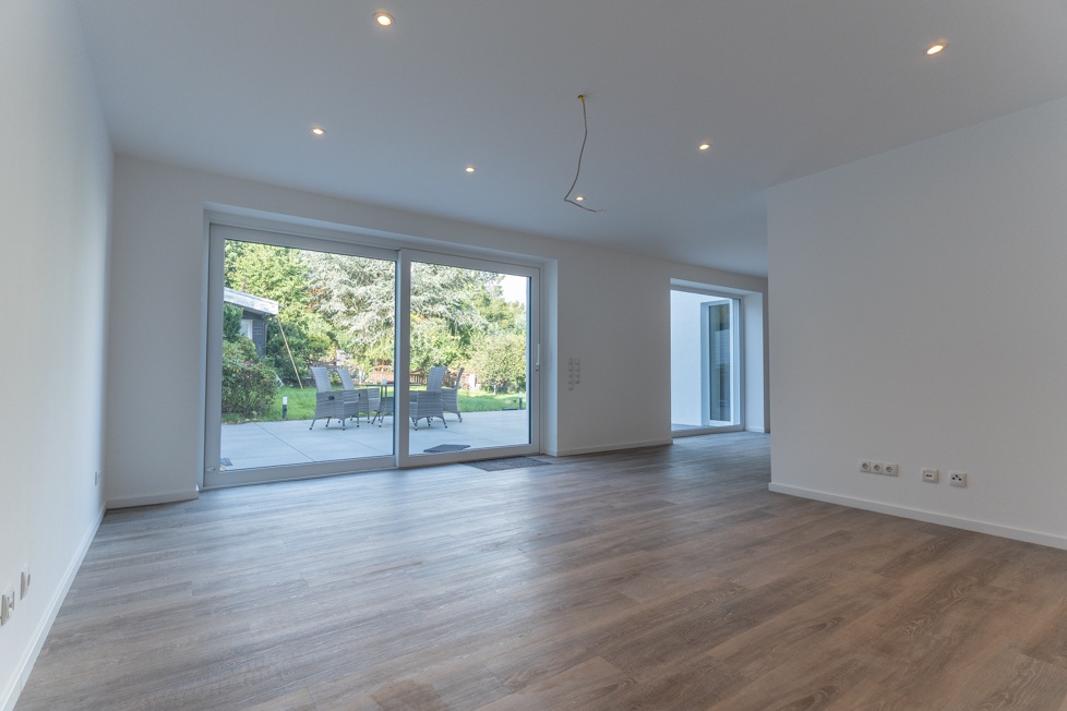 Der offen gestaltete Wohn- und Essbereich besticht durch seinen Blick und den Zugang zur schönen, nach Südwesten ausgerichteten Terrasse, die für viel Sonne und Licht sorgt. Dieser großzügige Bereich ist zur Diele hin durch zwei Glasschiebetüren flexibel abtrennbar.