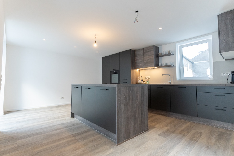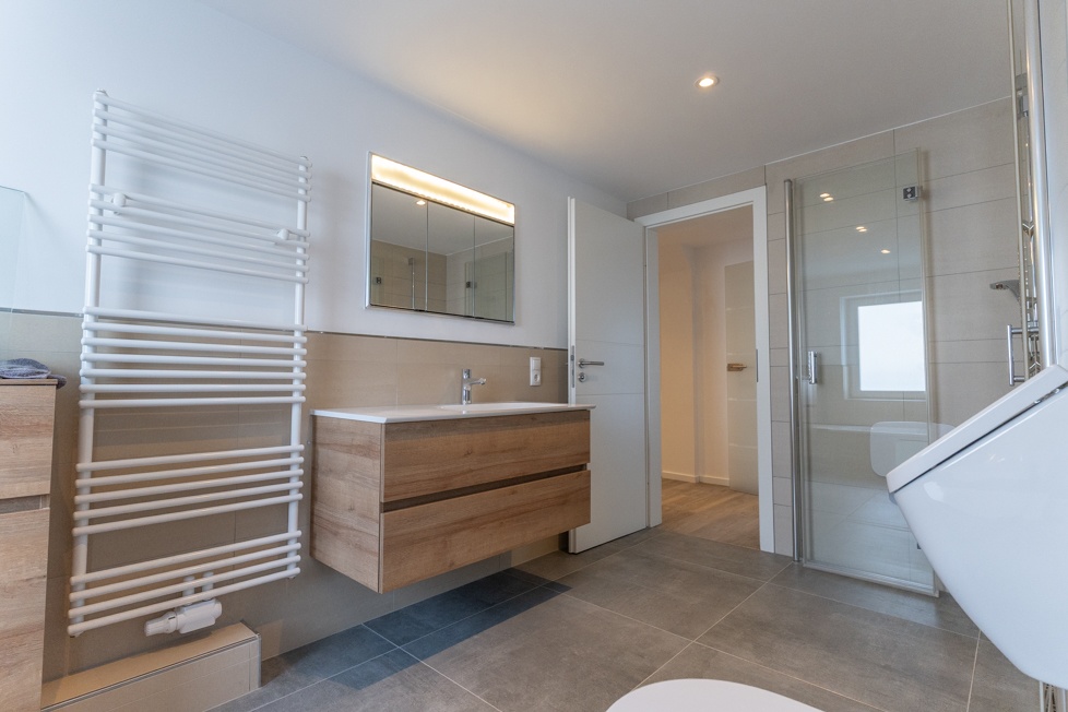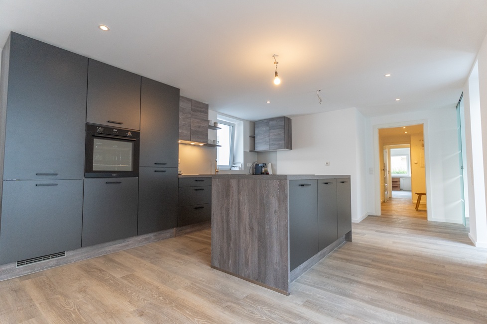 Eine weitere Schiebetür verbindet den Wohnbereich mit der Küche, die ebenfalls über einen Terrassenzugang verfügt und eine zur kostenfreien Nutzung überlassene Küchenzeile beinhaltet. Von der Küche führt ein weiterer Flur zum modernen Tageslichtbad mit Dusche und Badewanne sowie zurück in den Eingangsbereich.