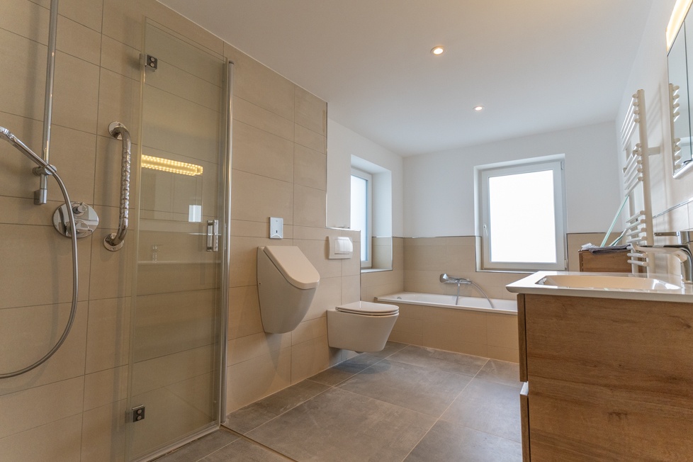 Badezimmer: Helles Tageslichtbad mit Dusche und Badewanne mit beigen Fliesen