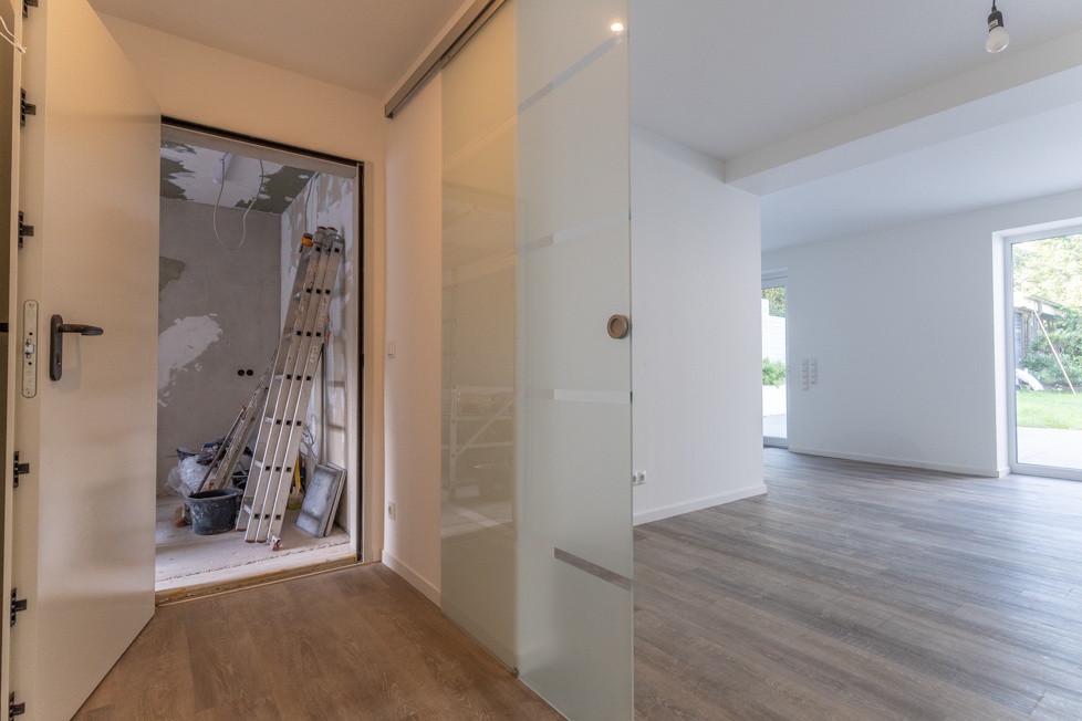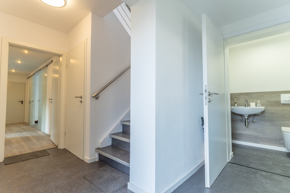 Sie erreichen Ihre Immobilie bequem über den Garagenstellplatz mit direktem Zugang in die Wohnung oder durch das neu gestaltete Treppenhaus, in dem sich ein Gäste-WC befindet.