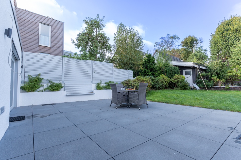 Die großzügige Terrasse bietet viel Platz für eine gemütliche Sitzgruppe und die Möglichkeit zur Teilmitbenutzung des Gartens.