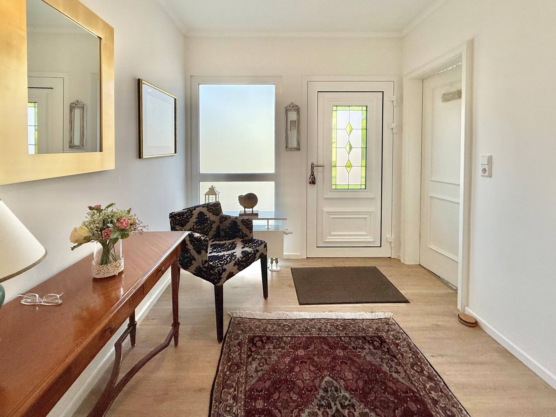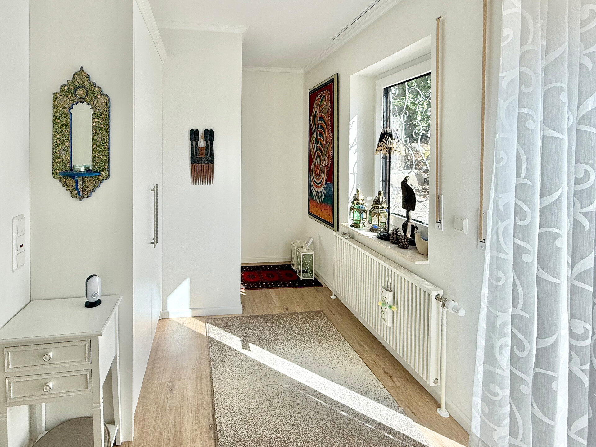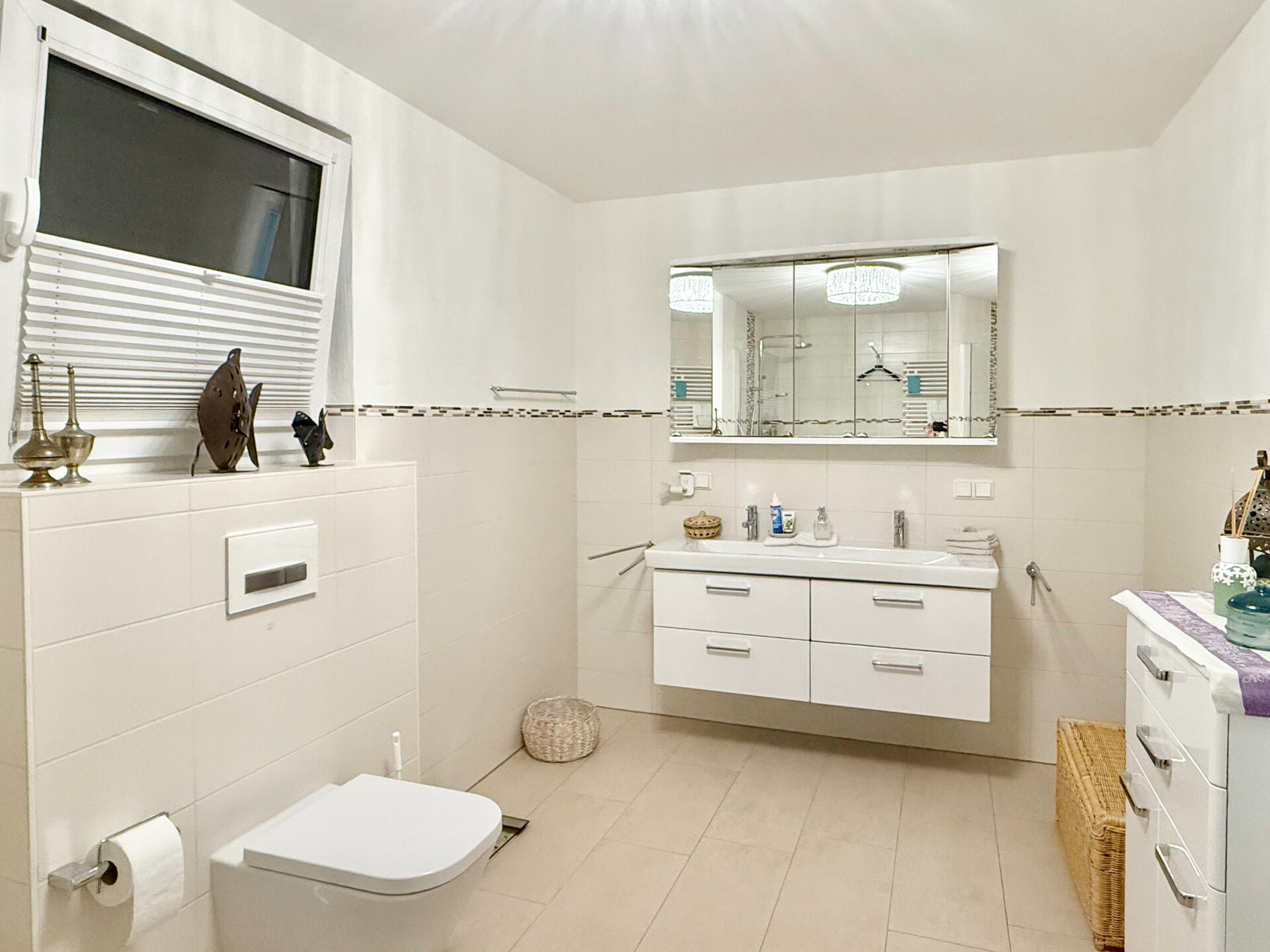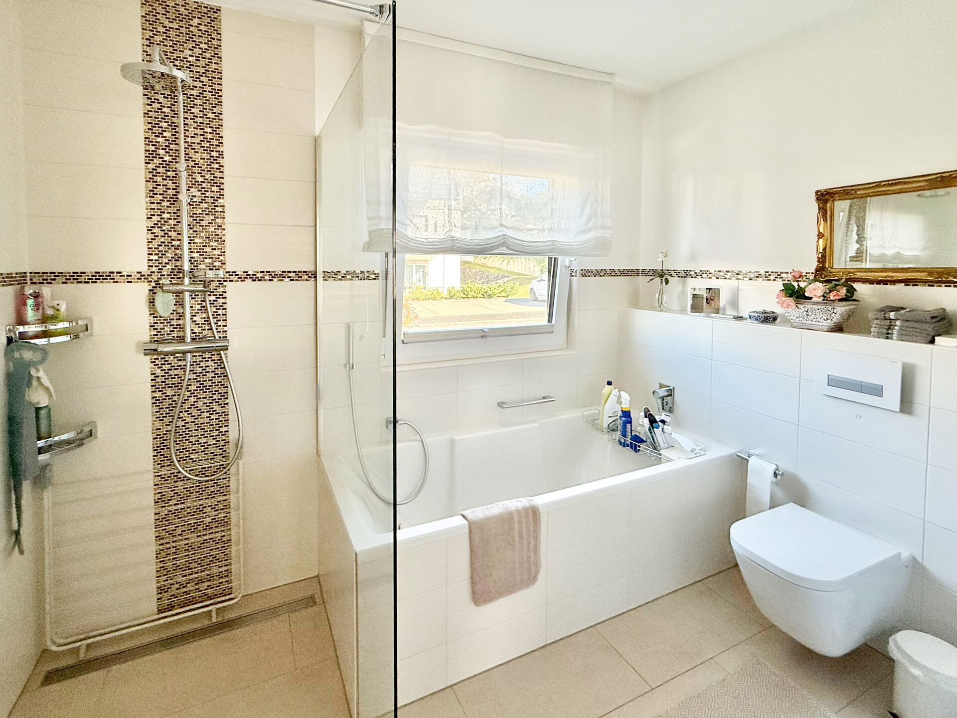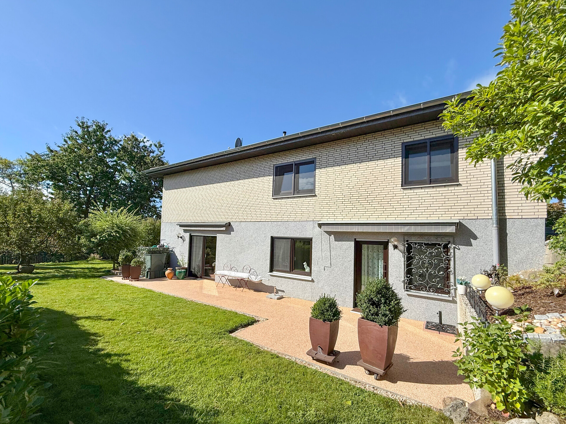 Auf rund 219 m² Wohnfläche bietet es eine gelungene Kombination aus Großzügigkeit, Komfort und durchdachter Raumaufteilung. Die helle Diele mit Garderobe und Gäste-WC führt in den offenen Wohn-/Essbereich, der mit seiner Weitläufigkeit, den bodentiefen Fenstern und dem Ausblick ins Grüne sofort überzeugt. Die Küche ist funktional geplant, mit hochwertigen Elektrogeräten ausgestattet und verfügt über einen angrenzenden Vorratsraum. Vom Wohn- und Essbereich sowie dem Schlafzimmer aus gelangen Sie direkt auf die großzügige Terrasse mit Blick über den Garten und die angrenzenden Wiesen. Ergänzt wird das Erdgeschoss durch ein weiteres Zimmer (ideal als Büro oder Kinderzimmer) sowie ein modernes Tageslichtbad mit bodentiefer Dusche, Badewanne und Fußbodenheizung. Das ausgebaute Untergeschoss ist sowohl über das Erdgeschoss als auch über einen separaten Eingang zugänglich. Es bietet einen Wohnbereich mit EBK und Terrasse, ein Schlafzimmer, ein Duschbad mit bodentiefer Dusche und Fußbodenheizung, eine Sauna mit eigener Dusche sowie einen vielseitig nutzbaren Hobbyraum – der ideale Bereich für Gäste oder Teenager.
