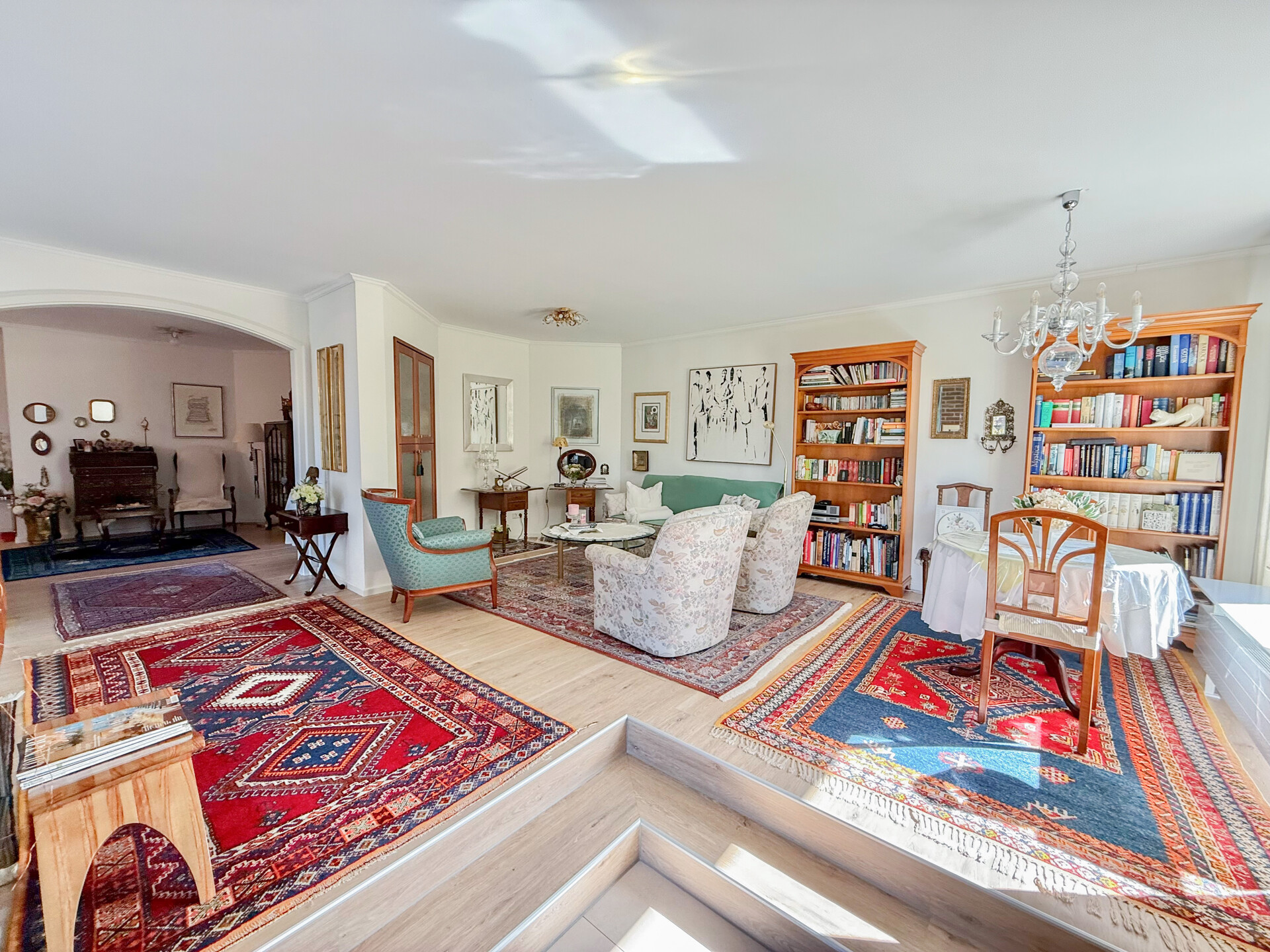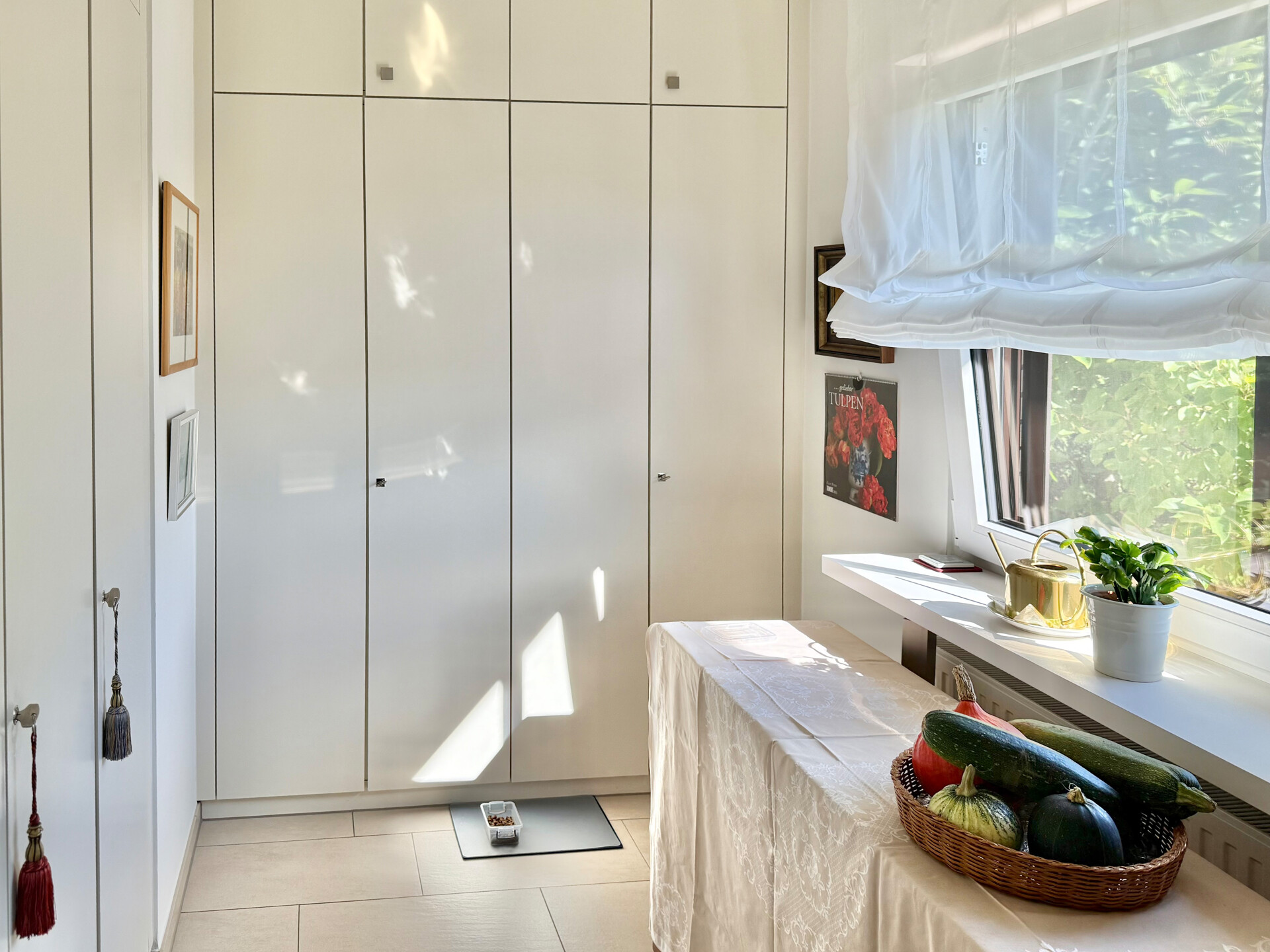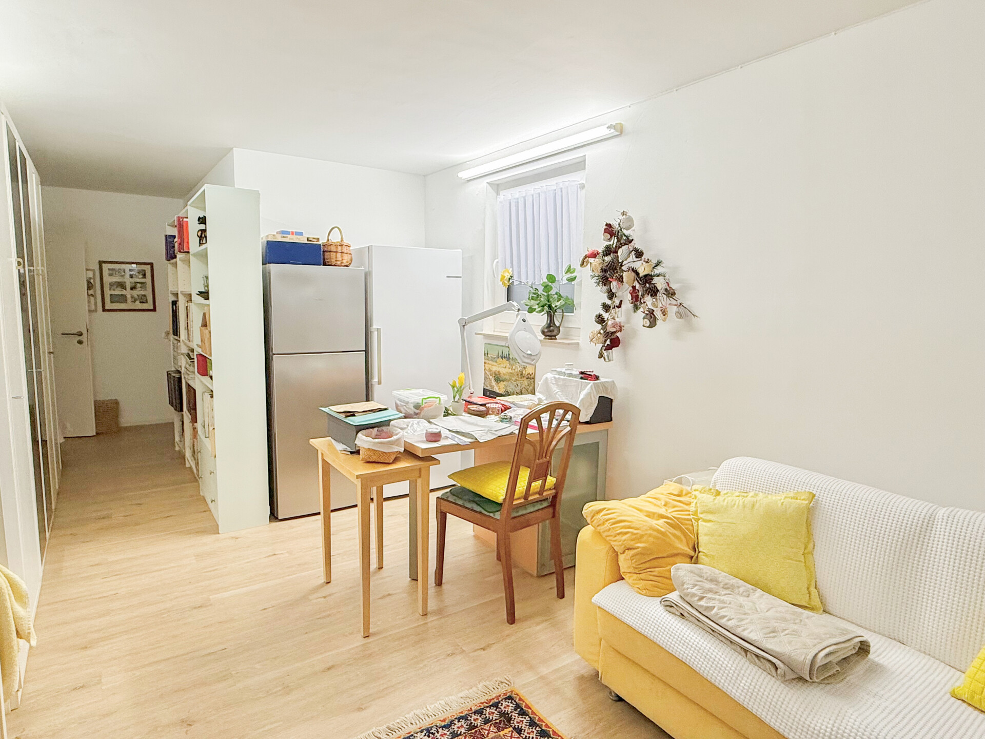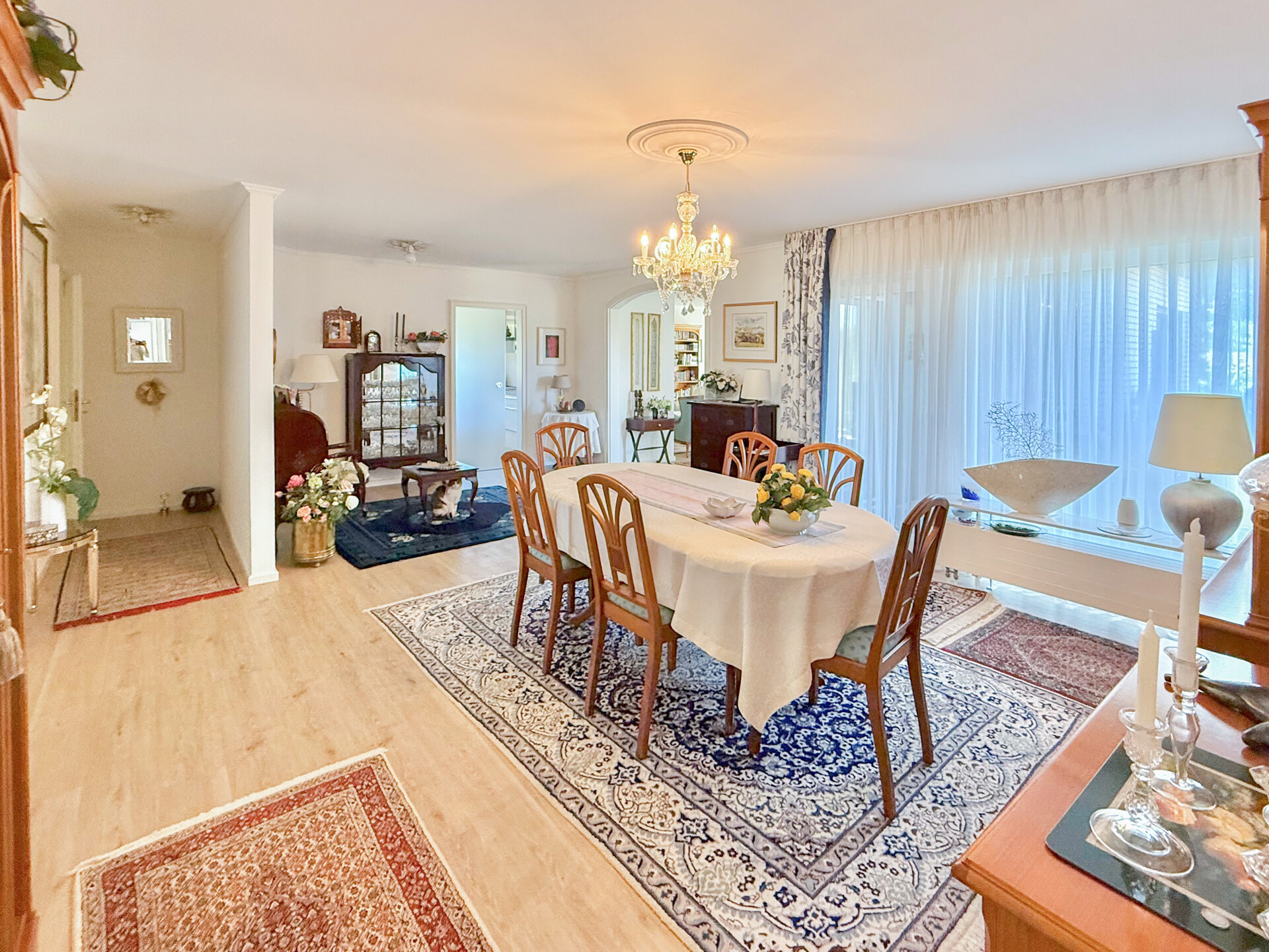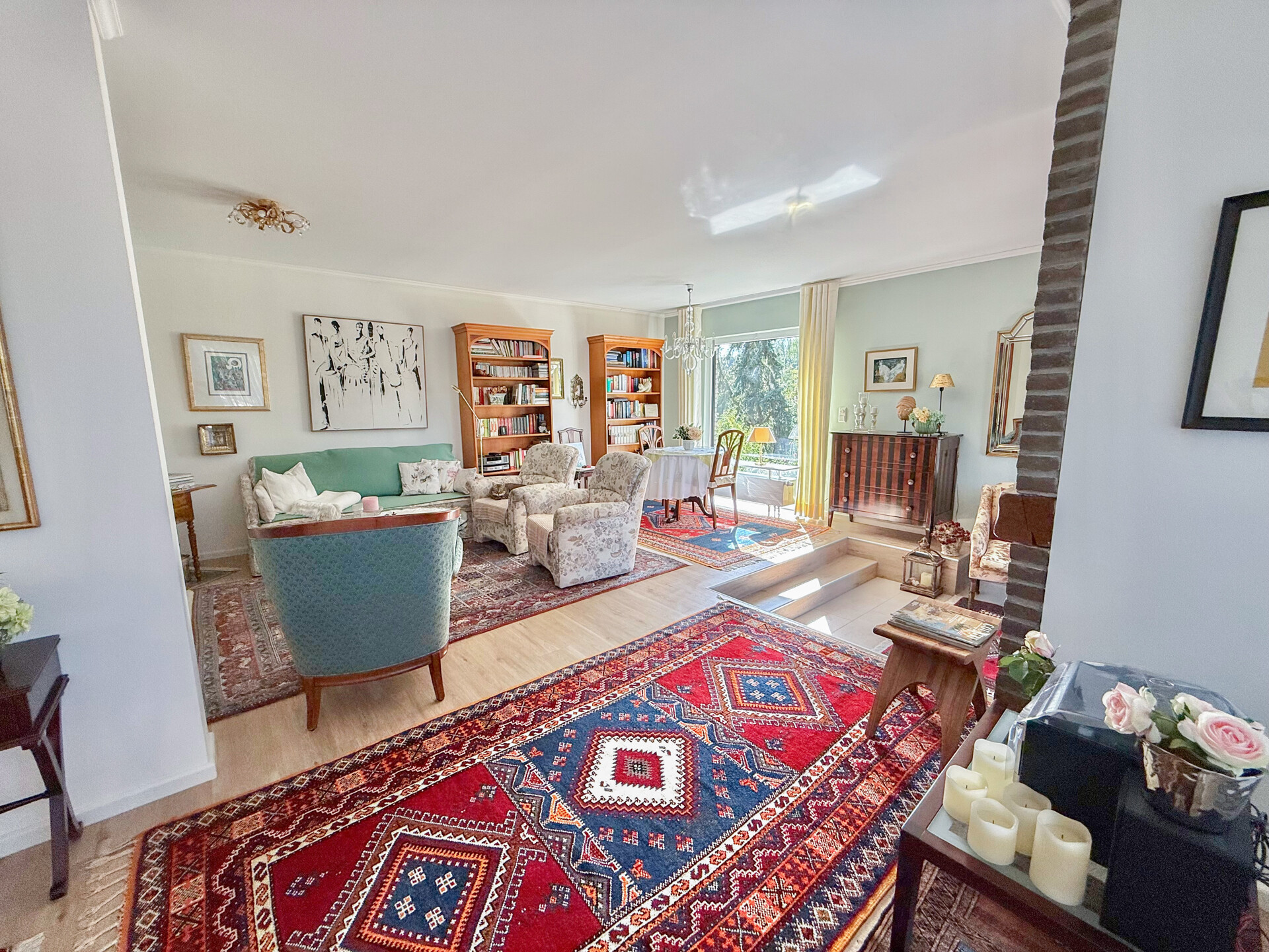Auf rund 219 m² Wohnfläche bietet es eine gelungene Kombination aus Großzügigkeit, Komfort und durchdachter Raumaufteilung. Die helle Diele mit Garderobe und Gäste-WC führt in den offenen Wohn-/Essbereich, der mit seiner Weitläufigkeit, den bodentiefen Fenstern und dem Ausblick ins Grüne sofort überzeugt. Die Küche ist funktional geplant, mit hochwertigen Elektrogeräten ausgestattet und verfügt über einen angrenzenden Vorratsraum. Vom Wohn- und Essbereich sowie dem Schlafzimmer aus gelangen Sie direkt auf die großzügige Terrasse mit Blick über den Garten und die angrenzenden Wiesen. Ergänzt wird das Erdgeschoss durch ein weiteres Zimmer (ideal als Büro oder Kinderzimmer) sowie ein modernes Tageslichtbad mit bodentiefer Dusche, Badewanne und Fußbodenheizung. Das ausgebaute Untergeschoss ist sowohl über das Erdgeschoss als auch über einen separaten Eingang zugänglich. Es bietet einen Wohnbereich mit EBK und Terrasse, ein Schlafzimmer, ein Duschbad mit bodentiefer Dusche und Fußbodenheizung, eine Sauna mit eigener Dusche sowie einen vielseitig nutzbaren Hobbyraum – der ideale Bereich für Gäste oder Teenager.