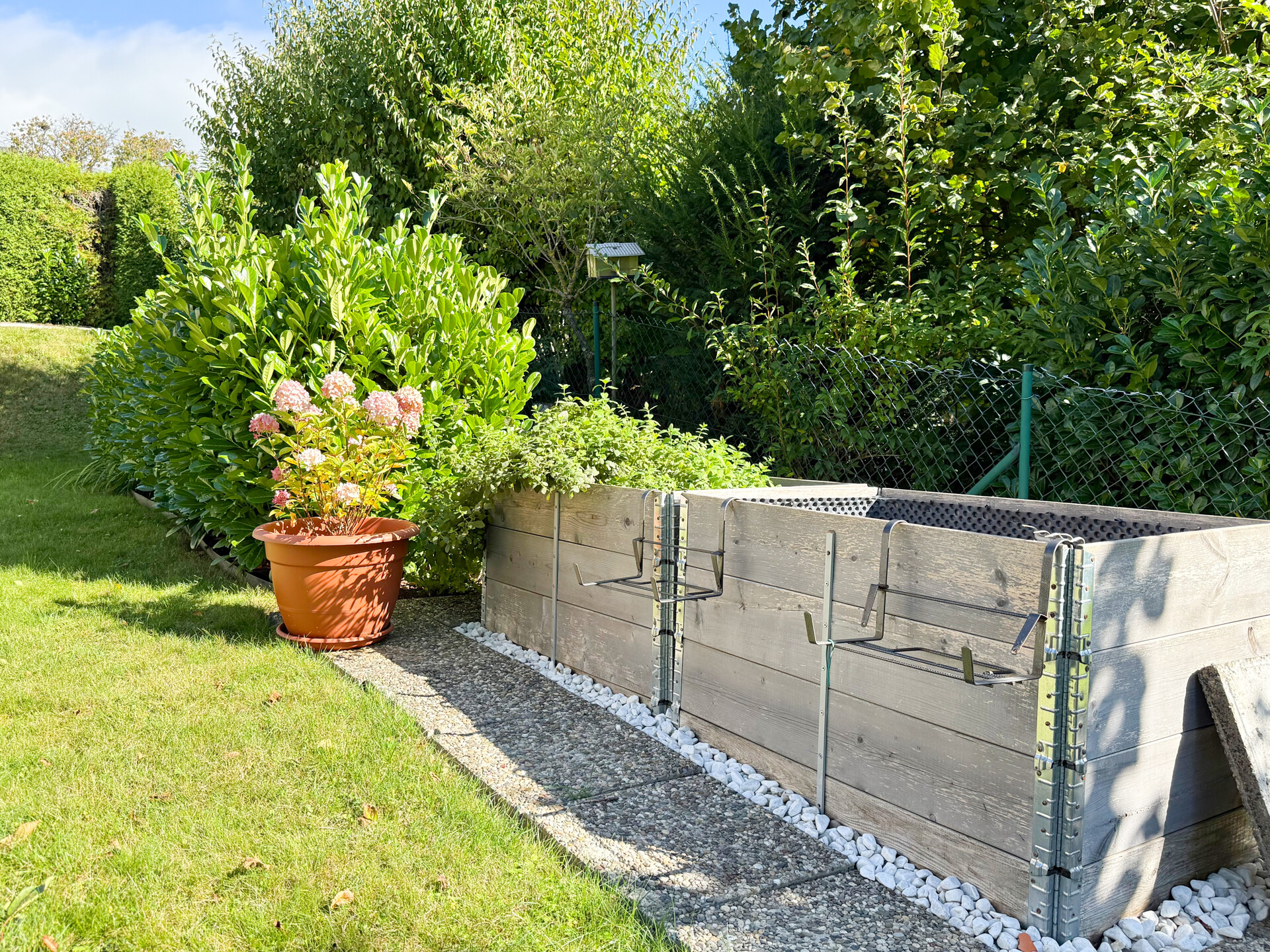 Eine Doppelgarage mit elektrischem Tor sowie ein zusätzlicher Bereich für Gartengeräte und Fahrräder runden dieses attraktive Angebot ab.