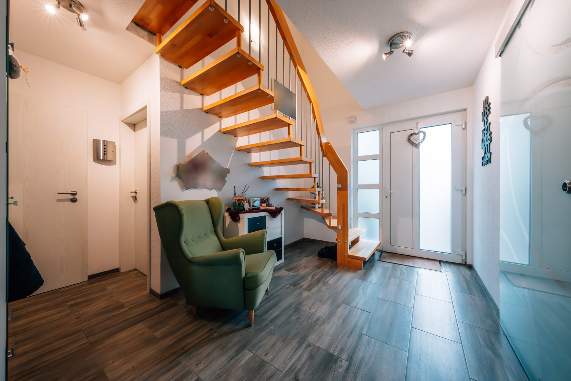 Einladender Eingangsbereich mit offener Holztreppe und freundlicher Atmosphäre