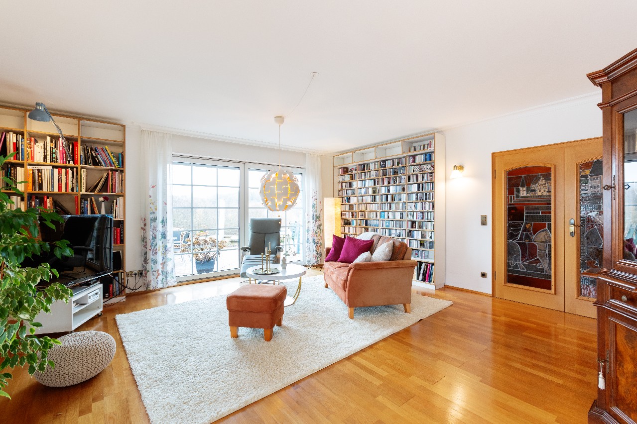 Der offen gestaltete Wohnbereich bietet direkten Zugang zum Wintergarten sowie zur großzügigen Terrasse und schafft eine harmonische Verbindung zwischen Innen- und Außenraum.