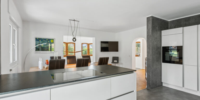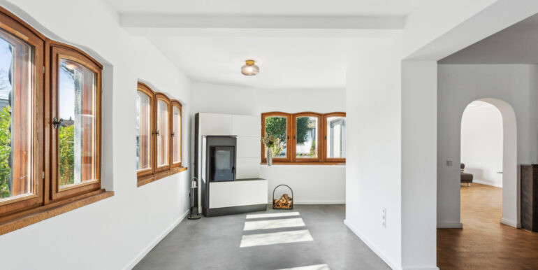 Ein Haus mit Charakter: Im Erdgeschoss erwarten Sie drei großzügige Räume, ein stilvolles Badezimmer sowie eine moderne, offene Küche. Das Herzstück bildet das elegante Kaminzimmer, das harmonisch an den Wohn- und Essbereich anschließt. Hier trifft nostalgisches Flair auf zeitgemäße Eleganz – aufgearbeitete Altholzfenster mit neuen Glaseinsätzen korrespondieren perfekt mit dem edlen Boden in Betonoptik. Für behagliche Wärme sorgt ein per Smartphone steuerbarer Hybrid-Kamin mit Pelletofen. Vom Wohn-, Küchen- und Kaminbereich aus gelangen Sie direkt auf zwei der insgesamt drei Terrassen – ideale Orte zum Entspannen, Grillen oder für gesellige Stunden im Freien.