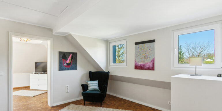 Im Dachgeschoss befinden sich zwei bis drei Schlafzimmer sowie ein hochwertig ausgestattetes Badezimmer mit ebenerdiger Dusche – perfekt für Familien oder Paare, die sich Raum für Gäste oder ein Home-Office wünschen.