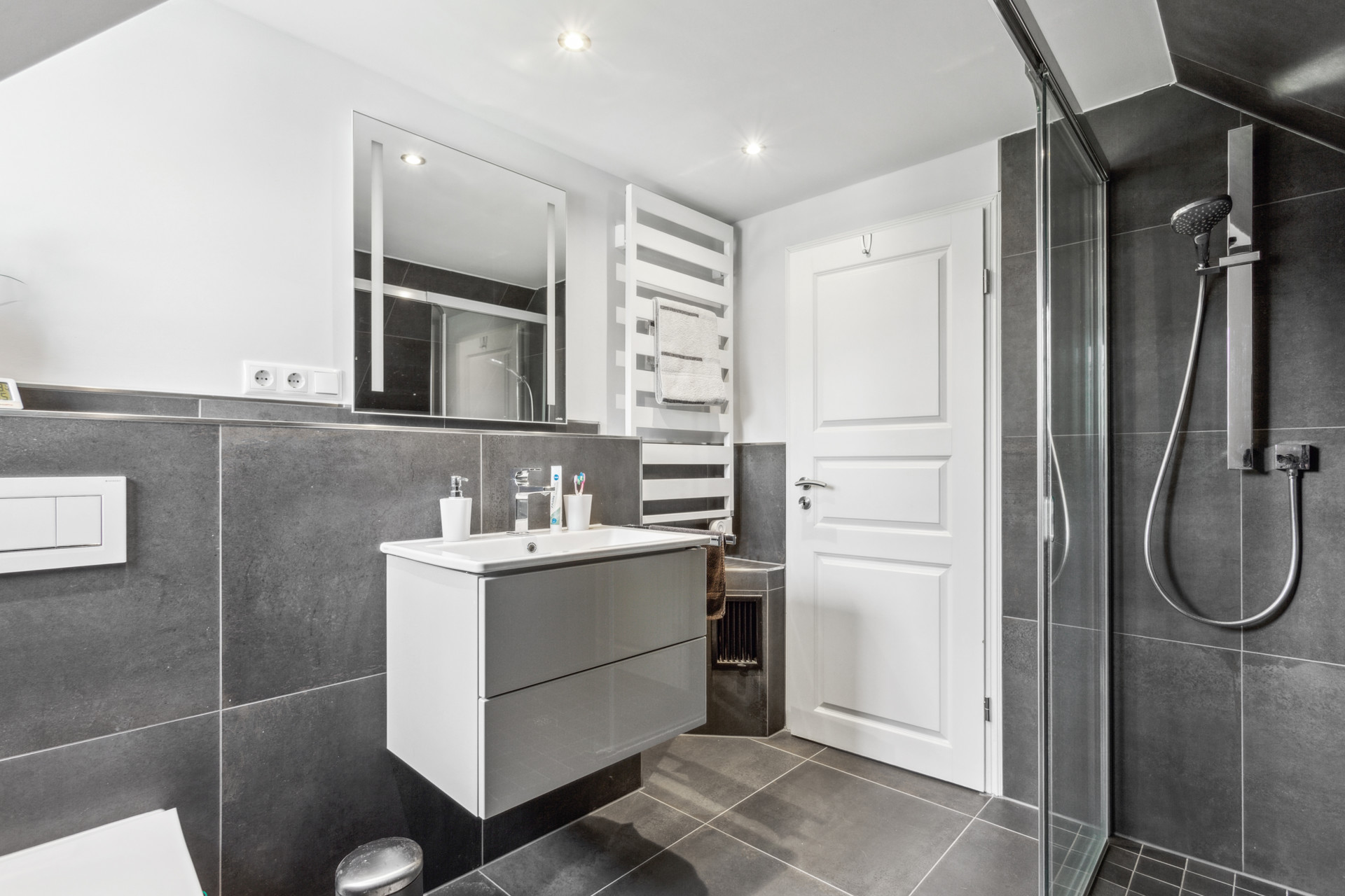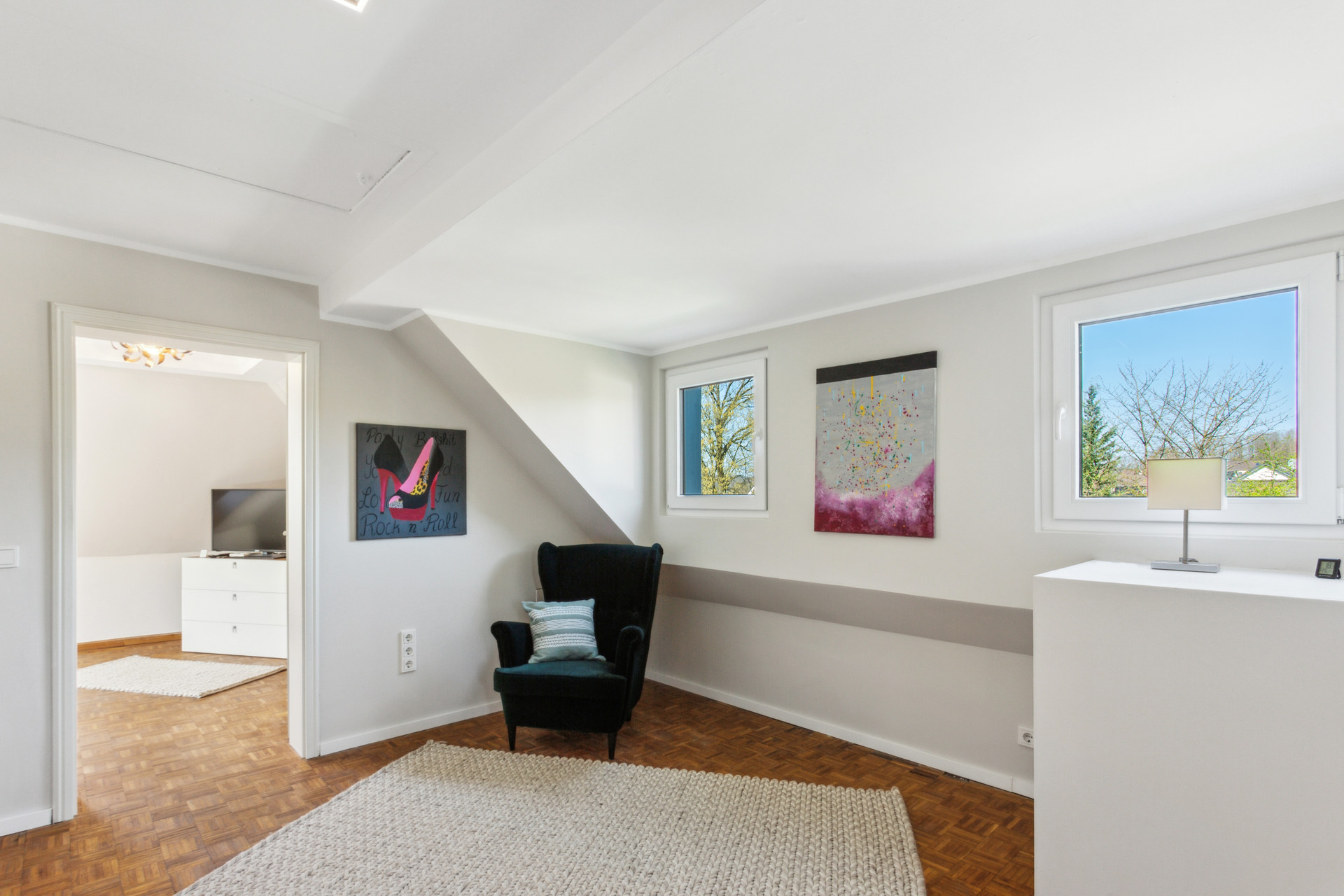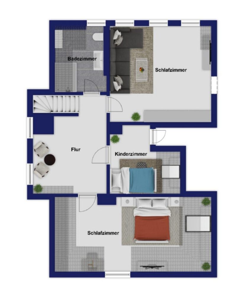 Im Dachgeschoss befinden sich zwei bis drei Schlafzimmer sowie ein hochwertig ausgestattetes Badezimmer mit ebenerdiger Dusche – perfekt für Familien oder Paare, die sich Raum für Gäste oder ein Home-Office wünschen.