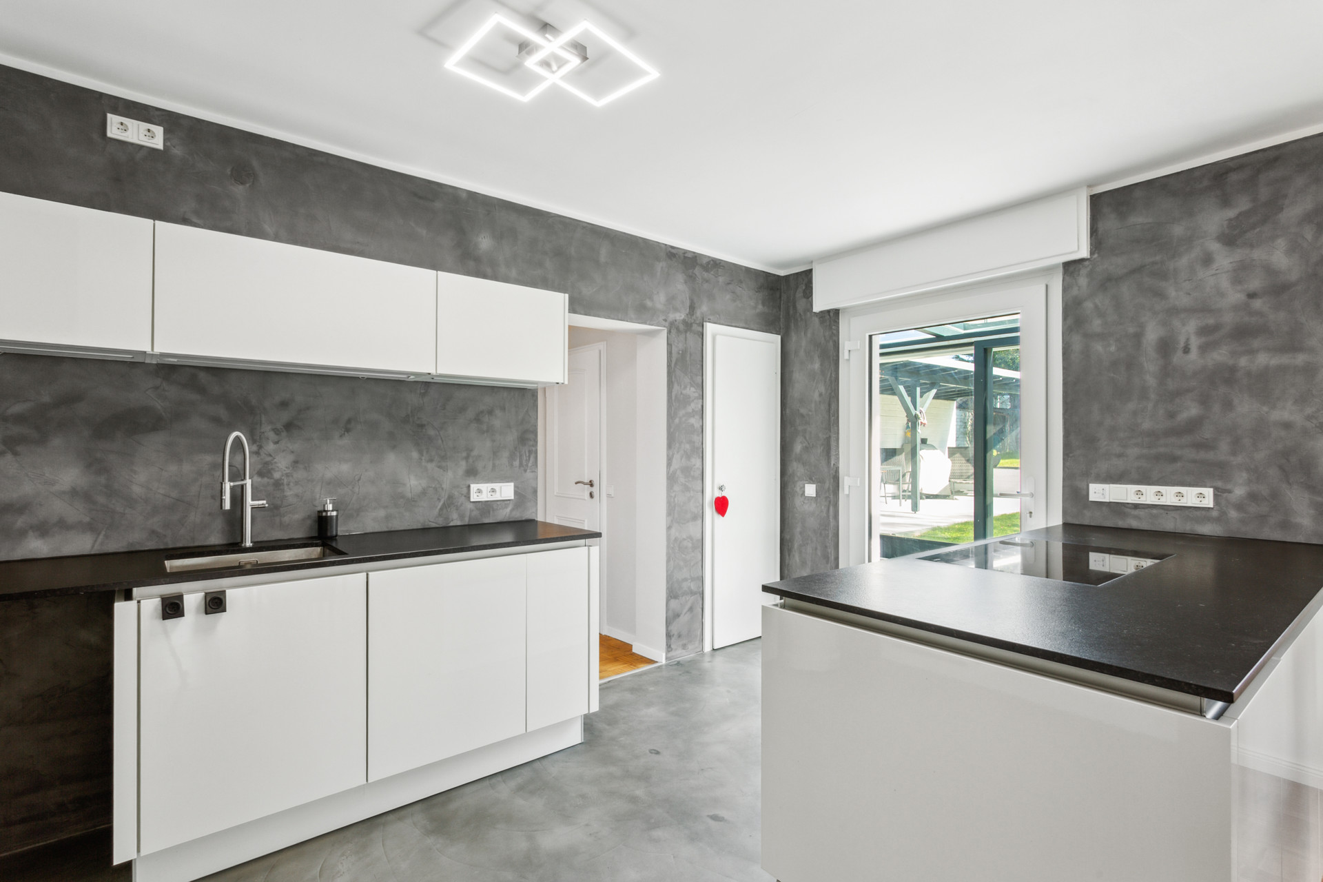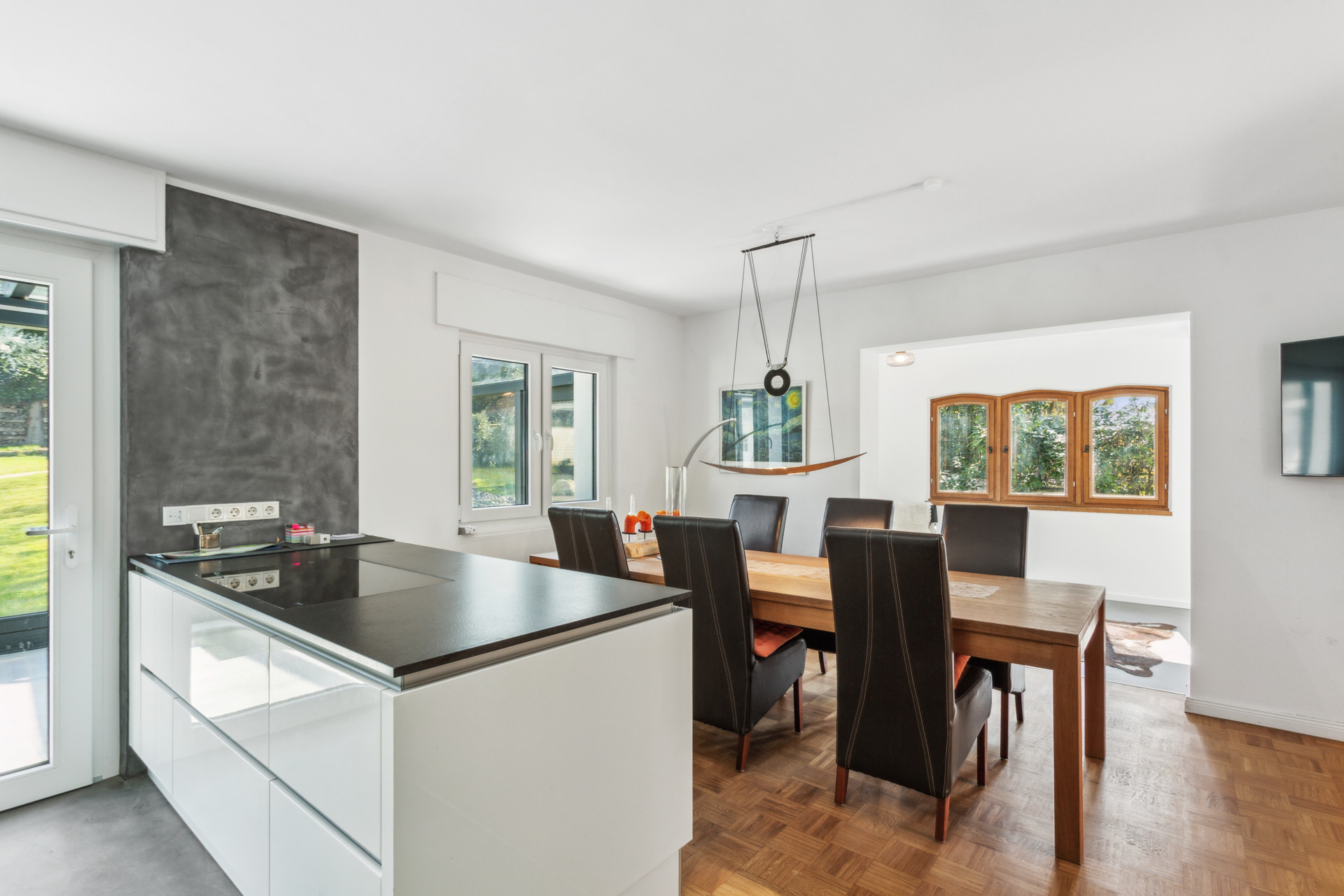 Ein Haus mit Charakter: Im Erdgeschoss erwarten Sie drei großzügige Räume, ein stilvolles Badezimmer sowie eine moderne, offene Küche. Das Herzstück bildet das elegante Kaminzimmer, das harmonisch an den Wohn- und Essbereich anschließt. Hier trifft nostalgisches Flair auf zeitgemäße Eleganz – aufgearbeitete Altholzfenster mit neuen Glaseinsätzen korrespondieren perfekt mit dem edlen Boden in Betonoptik. Für behagliche Wärme sorgt ein per Smartphone steuerbarer Hybrid-Kamin mit Pelletofen. Vom Wohn-, Küchen- und Kaminbereich aus gelangen Sie direkt auf zwei der insgesamt drei Terrassen – ideale Orte zum Entspannen, Grillen oder für gesellige Stunden im Freien.