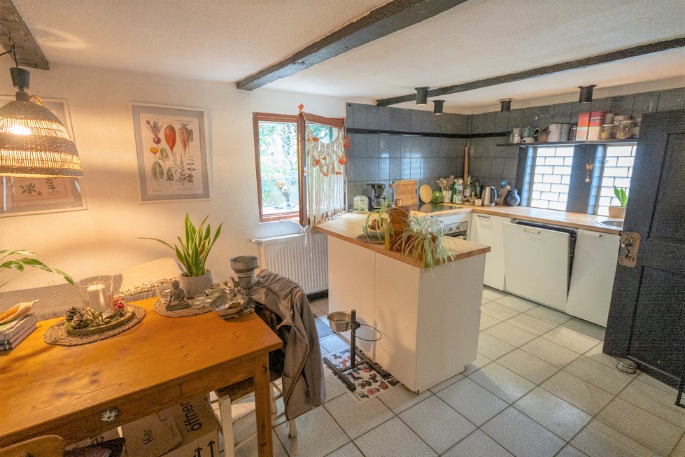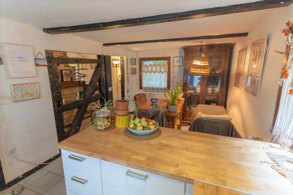 Das Herzstück des Hauses ist der offene Wohn-/, Ess-/ und Küchenbereich im Erdgeschoss. Ein großer Kaminofen spendet hier wohlige Wärme, während die freiliegenden Fachwerkbalken eine unverwechselbare Atmosphäre schaffen urig, behaglich und voller Charakter.