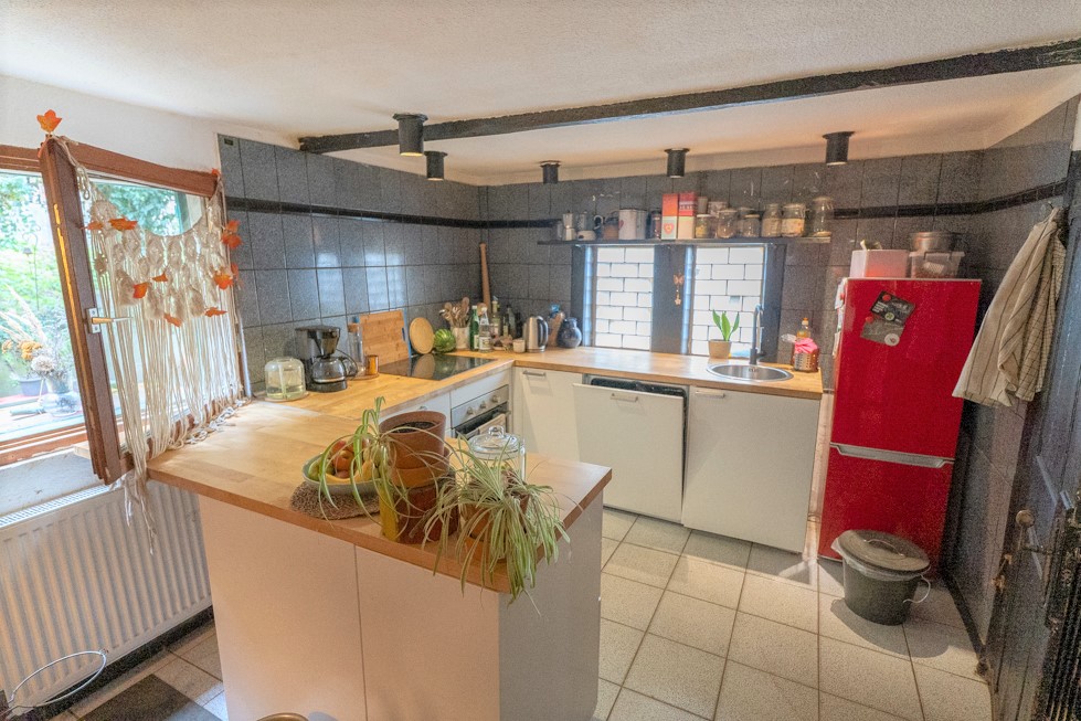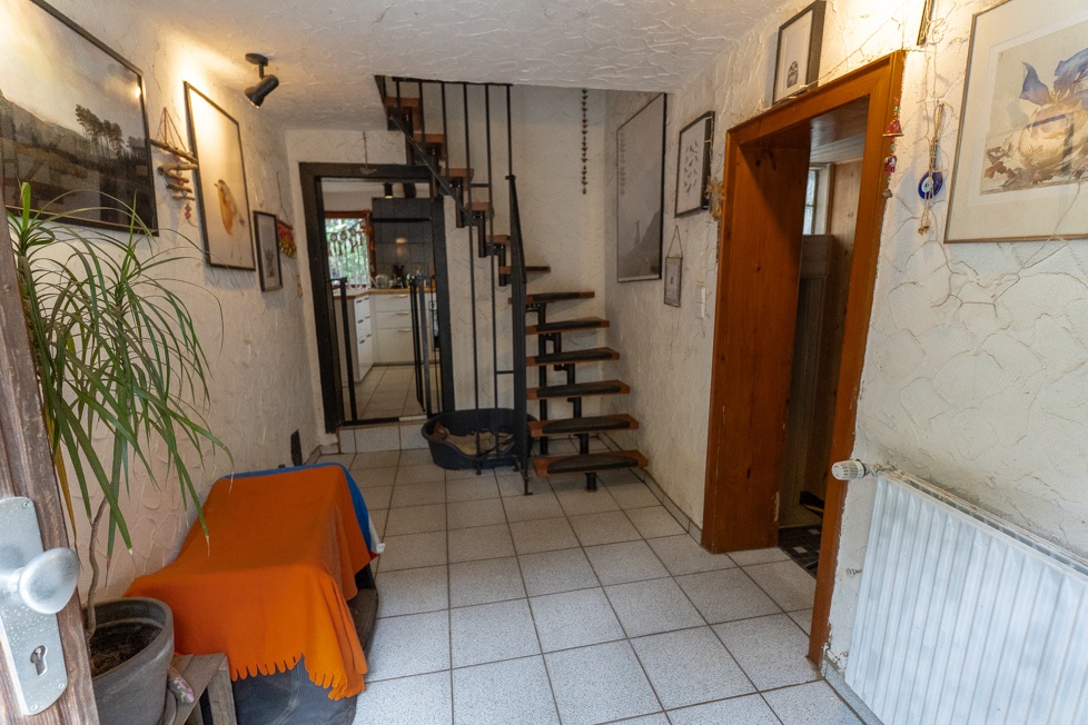 Im Inneren des Hauses empfängt Sie eine Eingangsdiele, die den Weg in das Obergeschoss, den Spitzboden und den offenen Wohn-/ Ess-/und Küchenbereich im Erdgeschoss öffnet. Auch der Anbau ist von hier aus zugänglich: Dort befinden sich ein separates WC, ein Tageslichtbad mit Dusche und Wanne sowie ein weiterer, tiefer gelegener Raum mit Zugang zum Garten und zur Teilunterkellerung.