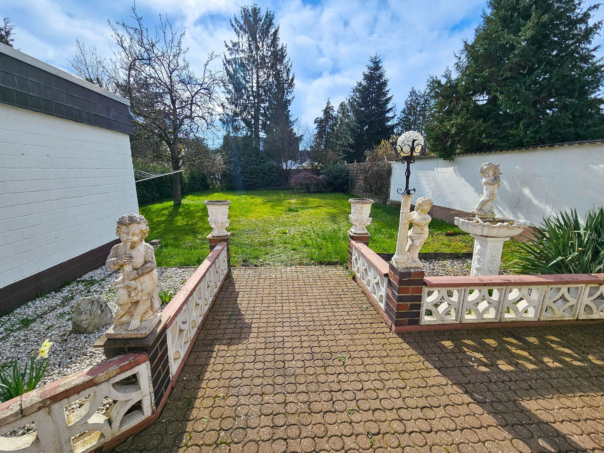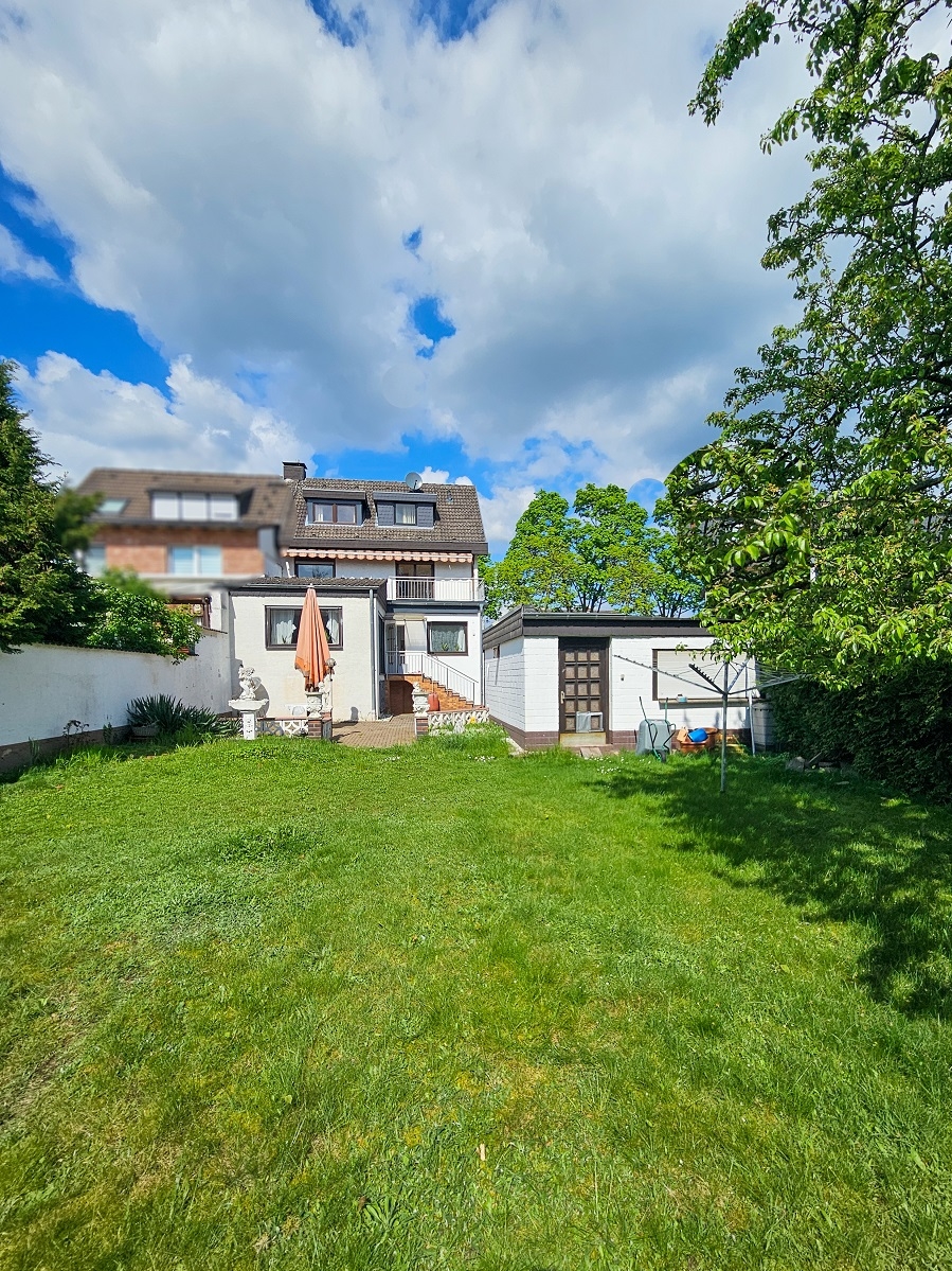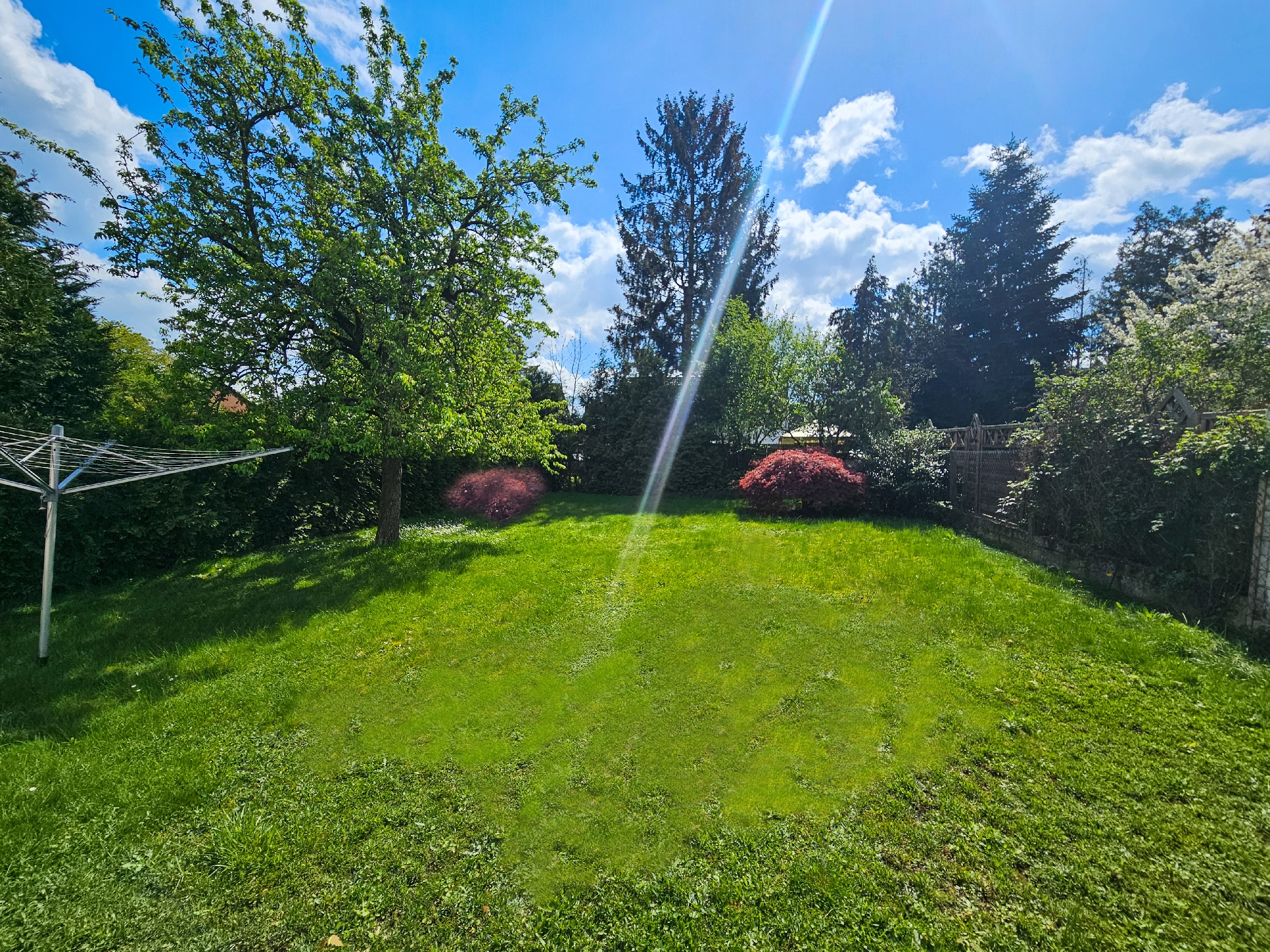 Der Bereich neben dem Haus und die Zufahrt zur Garage ist gepflastert. Die ebene Wiesenfläche bietet viele Freizeitmöglichkeiten und bietet Platz für Schaukel und Co.