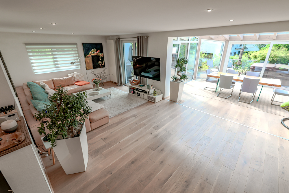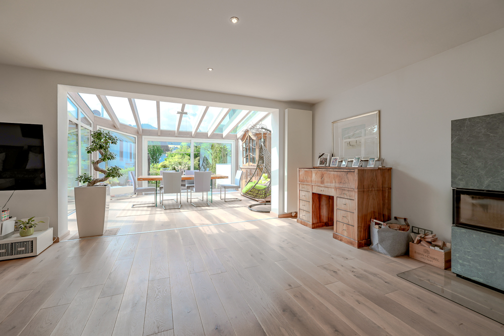 + Heller Wohn- und Essbereich dank großer Fensterflächen und Wintergarten