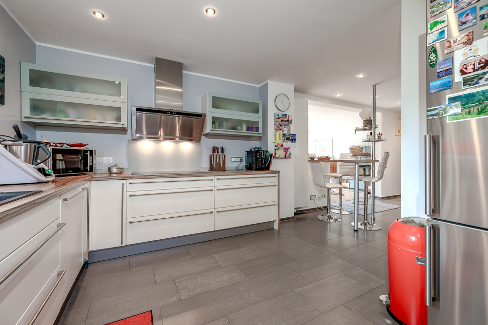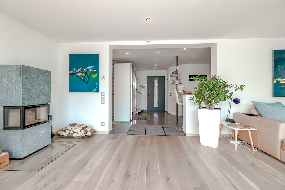 Das Haus präsentiert sich in einem modernen und gepflegten Zustand. Ein besonderes Highlight ist der große Wintergarten, der als Essbereich an den Wohnraum anschließt und für eine offene, einladende Atmosphäre sorgt. Große Fensterfronten schaffen helle Räume und einen wunderbaren Blick in den eigenen Garten. Die 2022 erneuerten Fenster, eine Gasheizung (Baujahr 2014) mit Fußbodenheizung im Erdgeschoss, die Einbauküche sowie ein Kamin ergänzen die hochwertige Ausstattung. Zudem wurden alle Leitungen, Böden und das Dach erneuert.