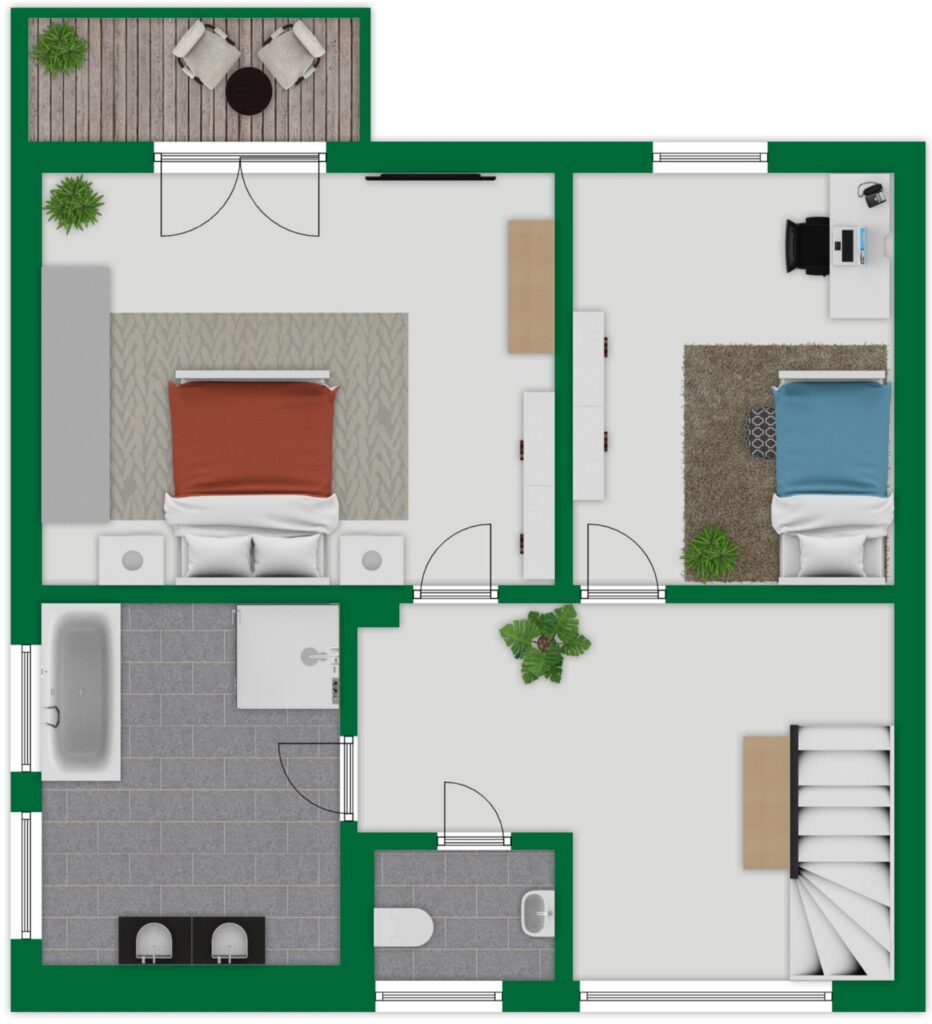 Im Obergeschoss stehen Ihnen zwei Schlafzimmer und ein Balkon mit herrlicher Fernsicht zur Verfügung. Ein stilvolles Badezimmer mit Doppelwaschbecken, Wanne und Dusche mit flachem Einstieg sowie ein separates WC vervollständigen das Raumangebot auf dieser Etage.