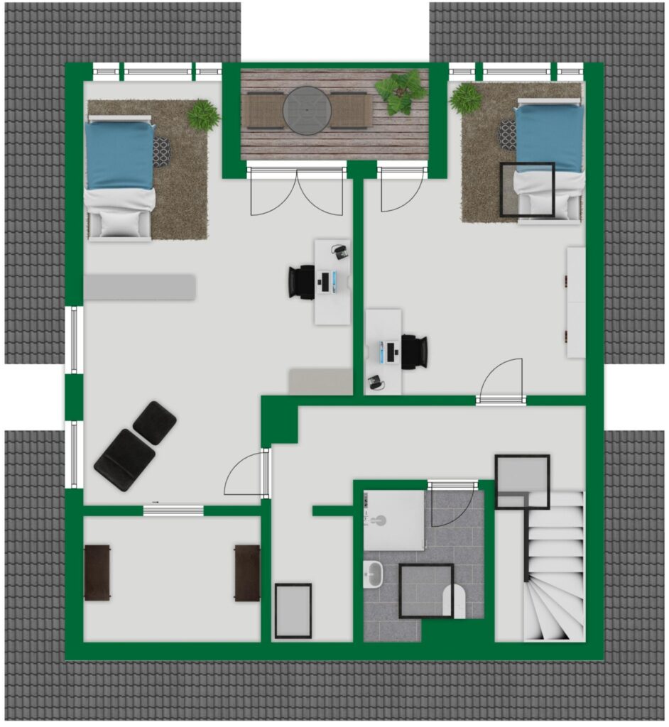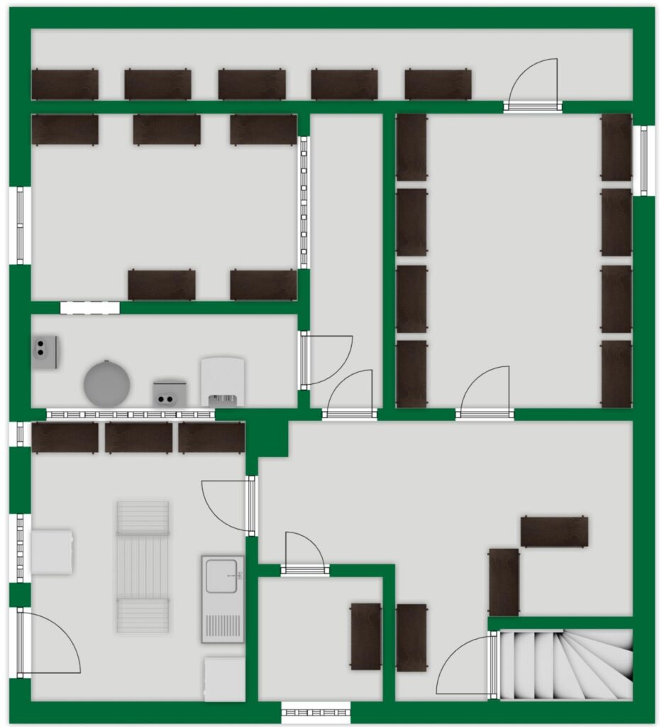 Die Raumaufteilung ist funktional und familiengerecht gestaltet. Im Erdgeschoss befinden sich das helle Wohnzimmer, die moderne Küche sowie der großzügige Wintergarten mit Zugang zur Terrasse. Ein Gäste-WC rundet den Grundriss auf dieser Etage ab.