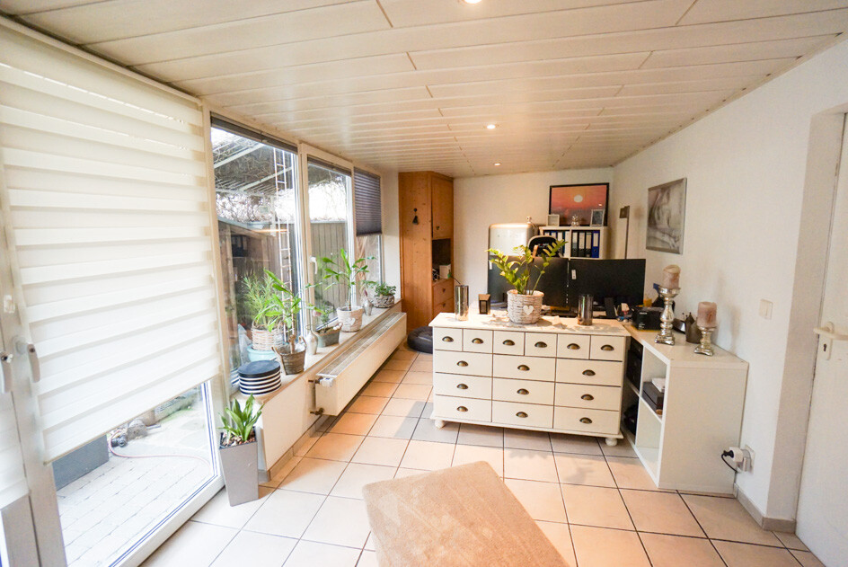 Der Zwischenraum von Küche im Erdgeschoss zur Garage ist lt. Grundrisszeichnung als Unterstellplatz für Gartengeräte bezeichnet. Dieser wurde in der Vergangenheit mit Fenstern ausgestattet und vollständig geschlossen. Hierzu lagen keine Genehmigungsunterlagen vor.