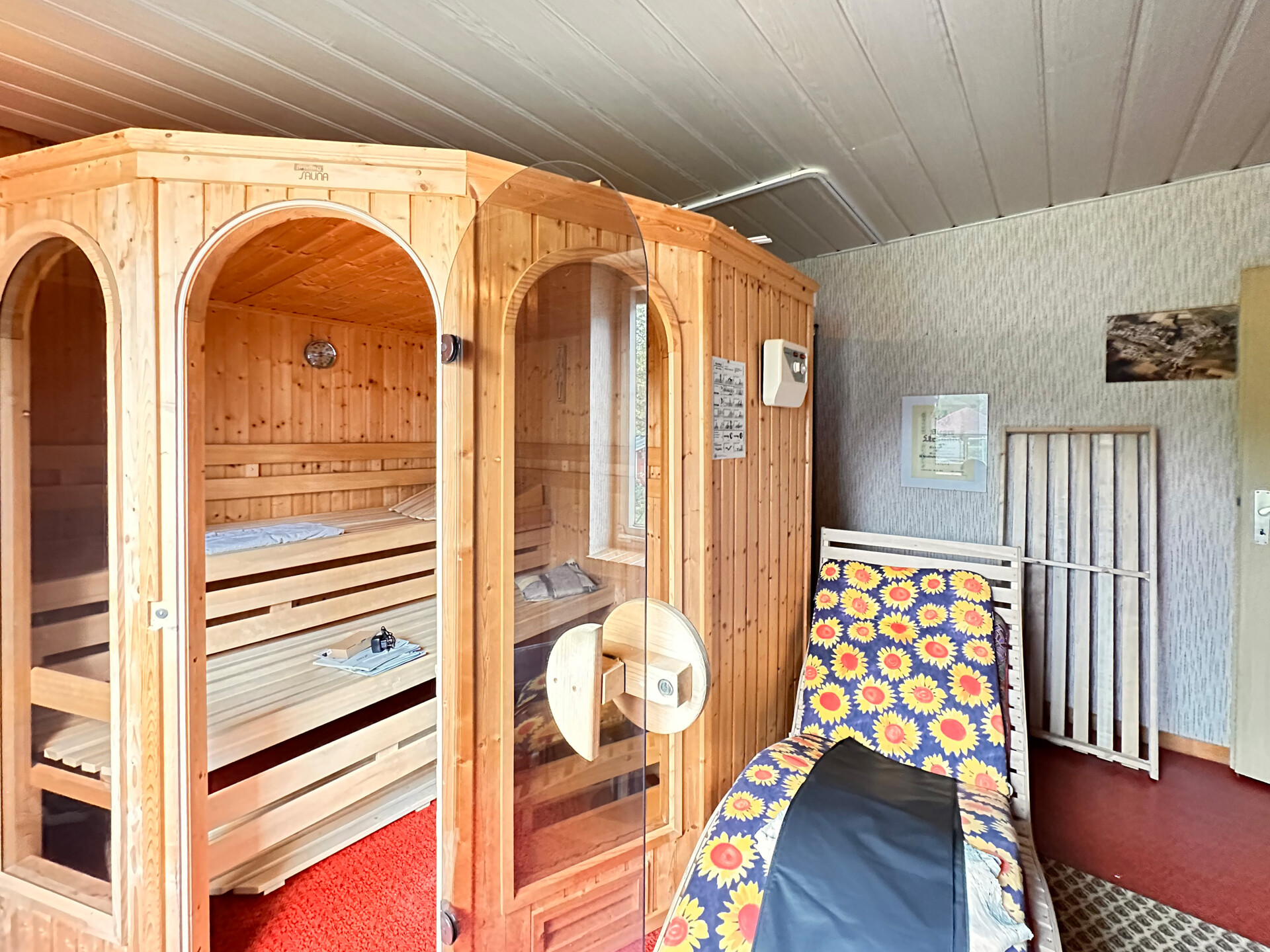 Der beheizte Keller bietet einen ansprechenden Wellnessraum mit Sauna, ein Schlafzimmer, ein Badezimmer sowie einen praktischen Abstellraum, der auch als Waschküche genutzt werden kann. Eine Garage mit elektrischem Tor sorgt für weiteren Platz für ein Fahrzeug und Stauraum.