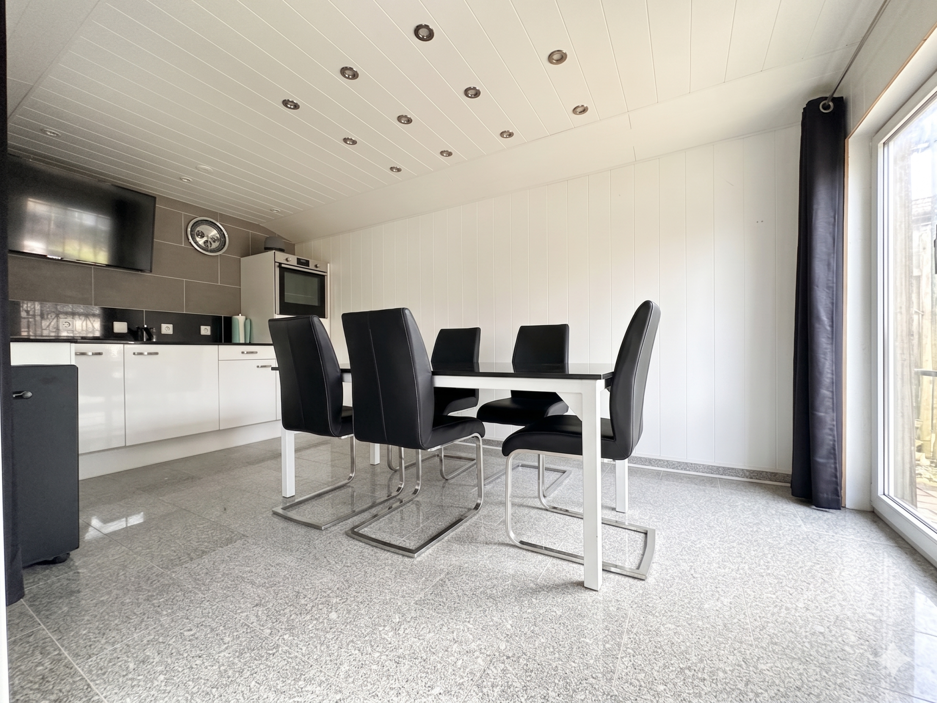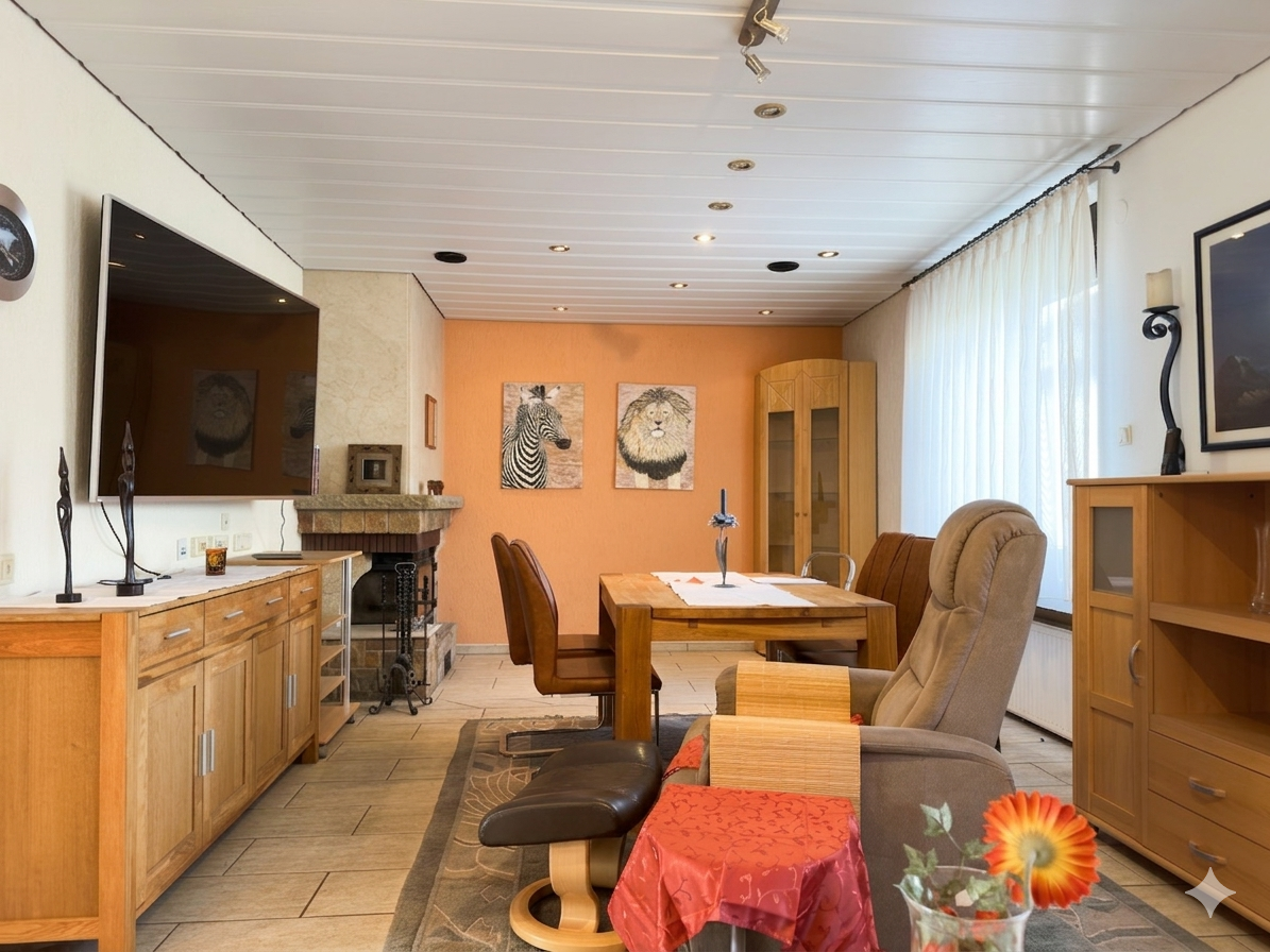 Im Erdgeschoss befindet sich ein Badezimmer mit Dusche und Badewanne. Die Küche verfügt über einen praktischen Zugang zu einem Kellerraum. Der Essbereich öffnet sich zur Terrasse und ist mit einem offenen Wohnbereich verbunden, der über einen Kamin verfügt und eine gemütliche Atmosphäre schafft.