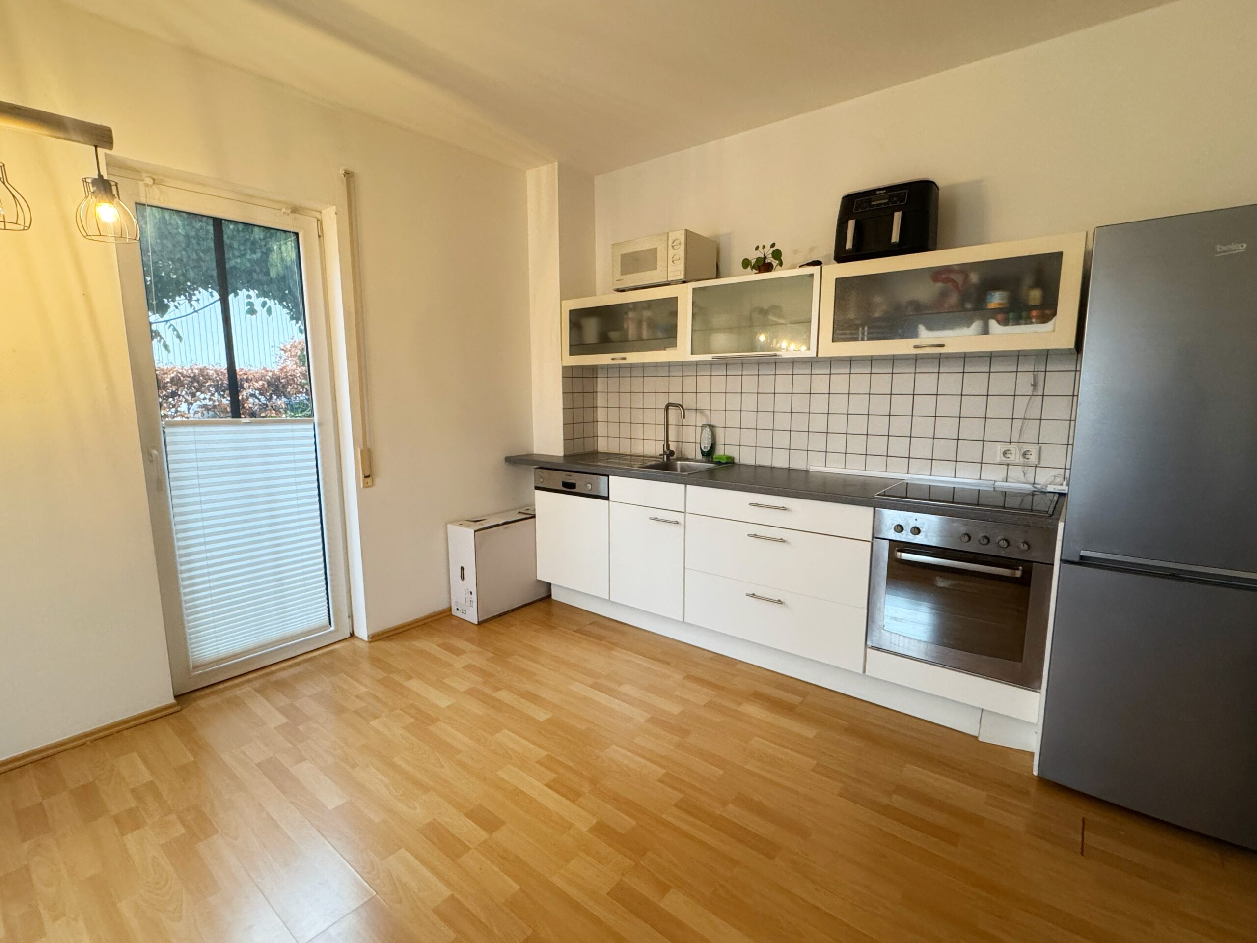 Sonnige 2-Zimmer-Einliegerwohnung mit eigener Terrasse. Ess-/ und Wohnzimmer mit offenem Küchenbereich, Schlafzimmer, Bad mit Dusche, Fenster und Waschmaschinenanschluss, Diele mit Abstellraum. Böden: Wohnräume Laminat, Diele und Bad helle Fliesen. Alle Fenster sind mit Rollläden ausgestattet. Die Wohnung ist ideal für Singles.